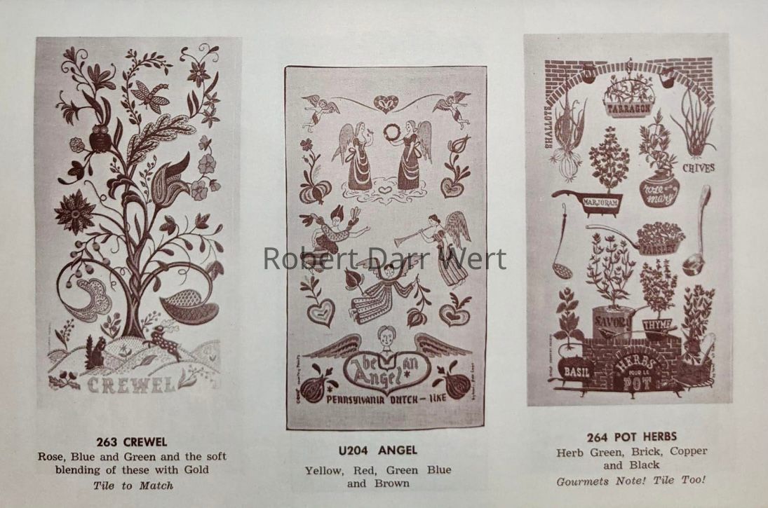 This is one of over sixty designs sold by Country Prints to Stevens Linen Associates of Dudley, Massachusetts, in January 1969. From that point onward, the designs were produced by Stevens with all reference to Robert Darr Wert and Country Prints removed. Many of these designs continued to be produced by Stevens throughout the 1970’s and some into the 1980’s.