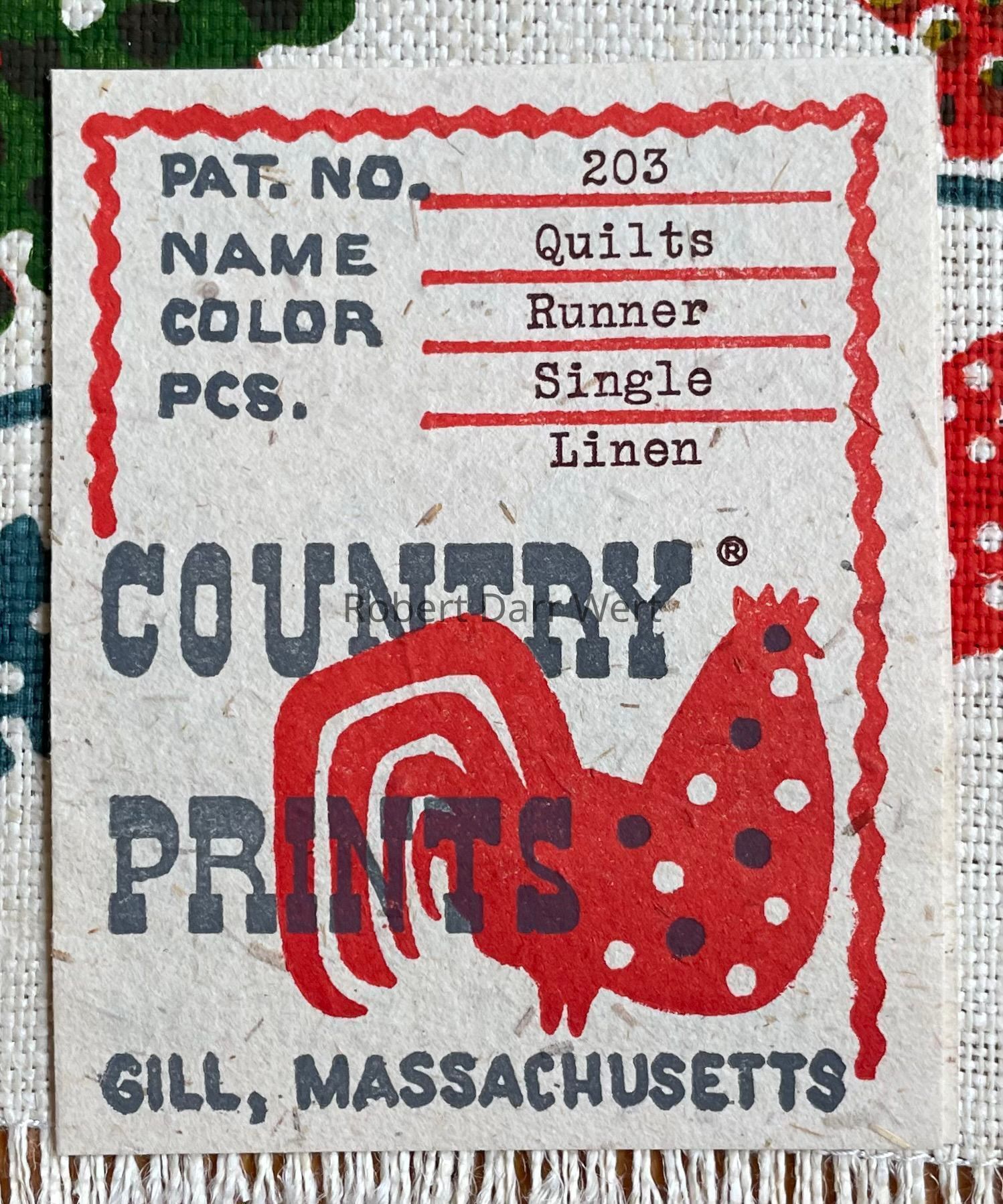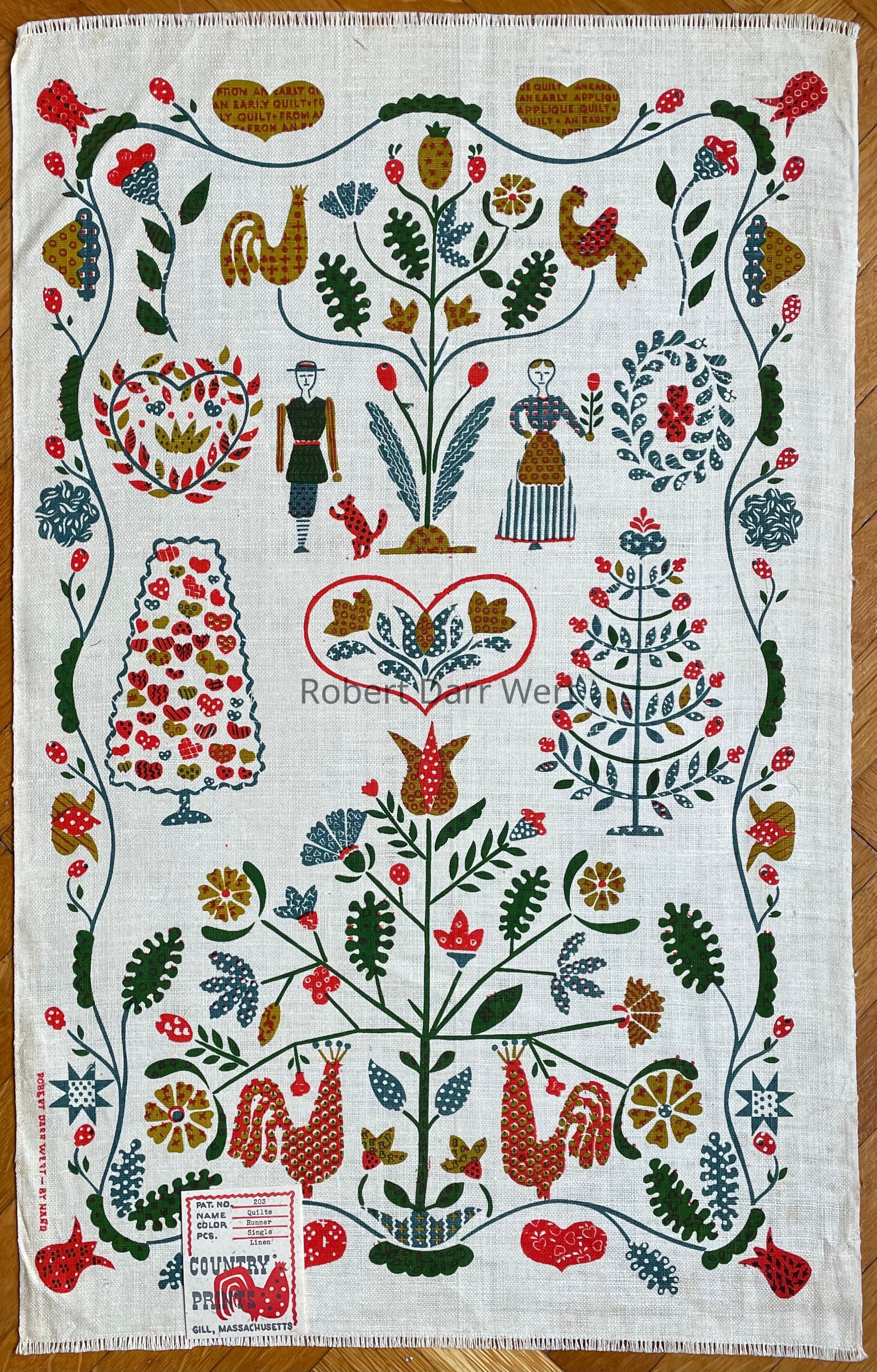 This print was marketed for use as a kitchen towel, wallhanging, or table runner, and is listed on a c.1951 Country Prints packing slip.Made/Created