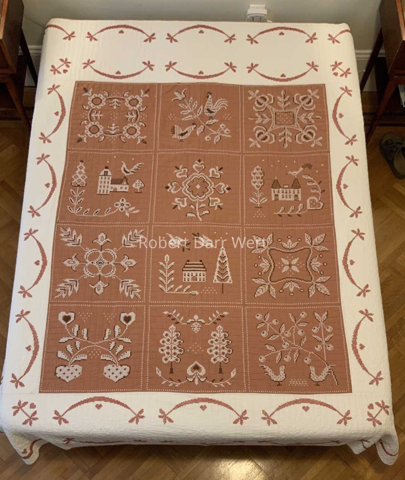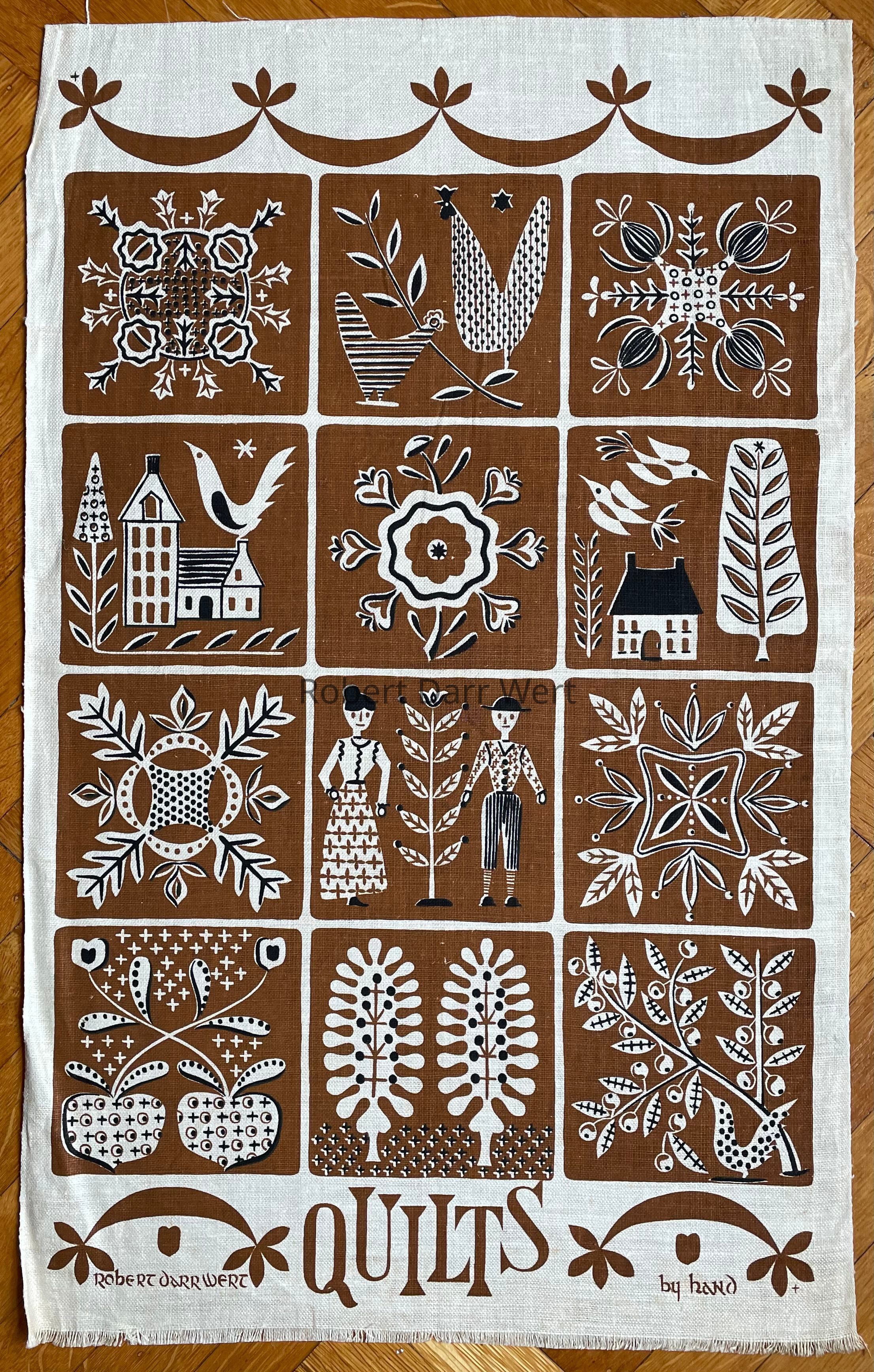 A two-color silkscreen print on off-white linen depicting twelve Pennsylvania “Dutch” appliqué quilt squares. The design is bordered at top and bottom with swags typical of appliqué quilts, and the lower edge bears the title “QUILTS” in hand-drawn type. Subjects of the quilt squares range from fruit, to fowl, to plant life, buildings, and a farm couple.