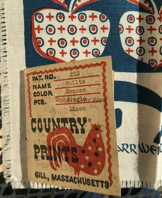 This print was marketed for use as a kitchen towel, wallhanging, or table runner, and is described on a c.1955 Country Prints price list, “Authentic appliqué quilt patterns on Red and Blue or Blue and Red on white and Black and Brown on natural.”