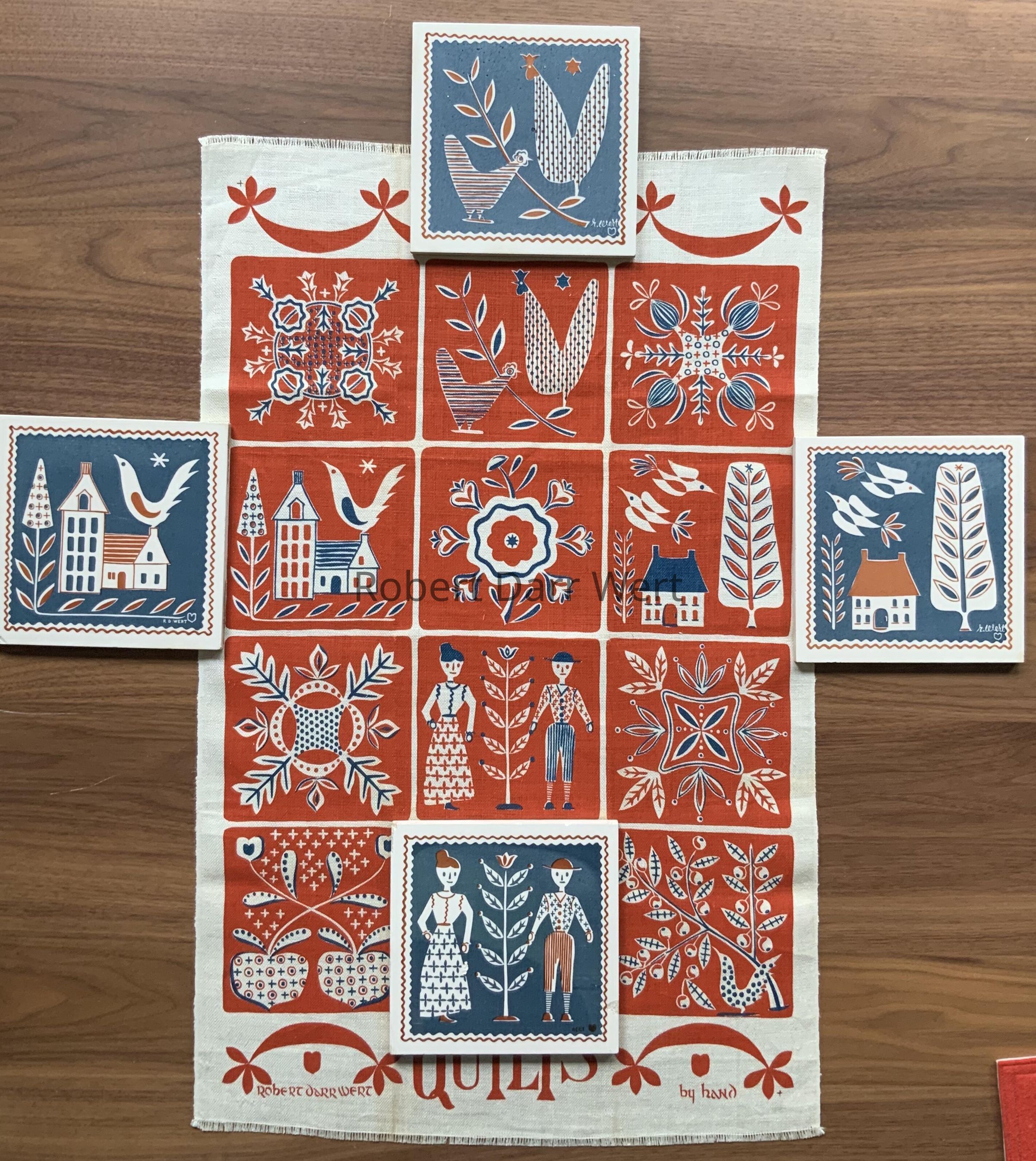 A two-color silkscreen print on off-white linen depicting twelve Pennsylvania “Dutch” appliqué quilt squares. The design is bordered at top and bottom with swags typical of appliqué quilts, and the lower edge bears the title “QUILTS” in hand-drawn type. Subjects of the quilt squares range from fruit, to fowl, to plant life, buildings, and a farm couple.