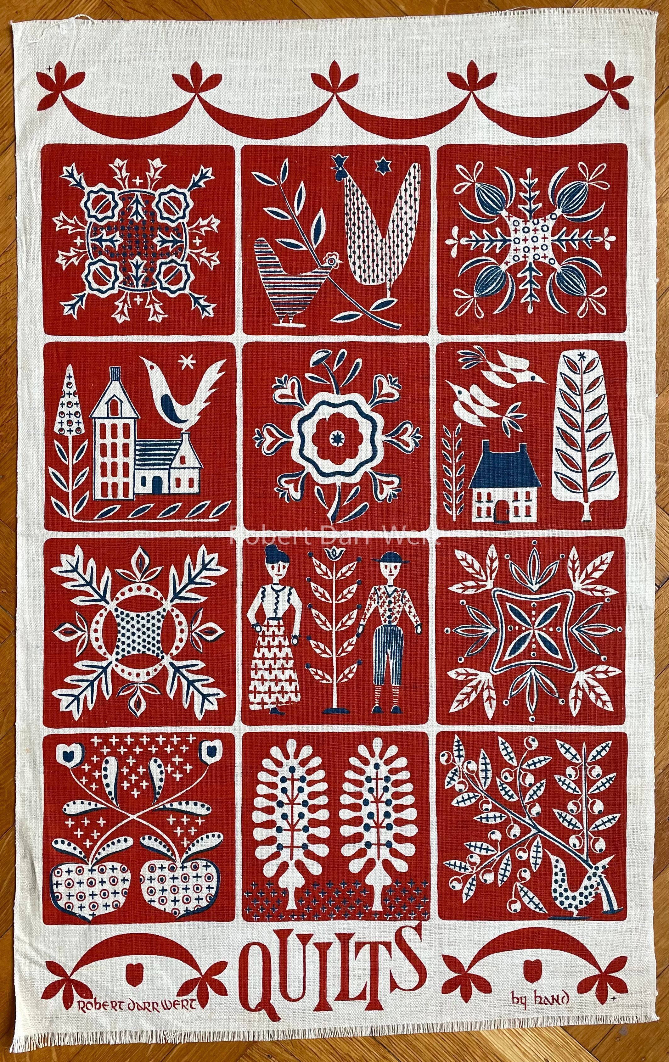 A c.1955 Country Prints price list describes this towel/runner, “Authentic appliqué quilt patterns in Red and Blue or Blue and Red on white and Black and Brown on natural.”