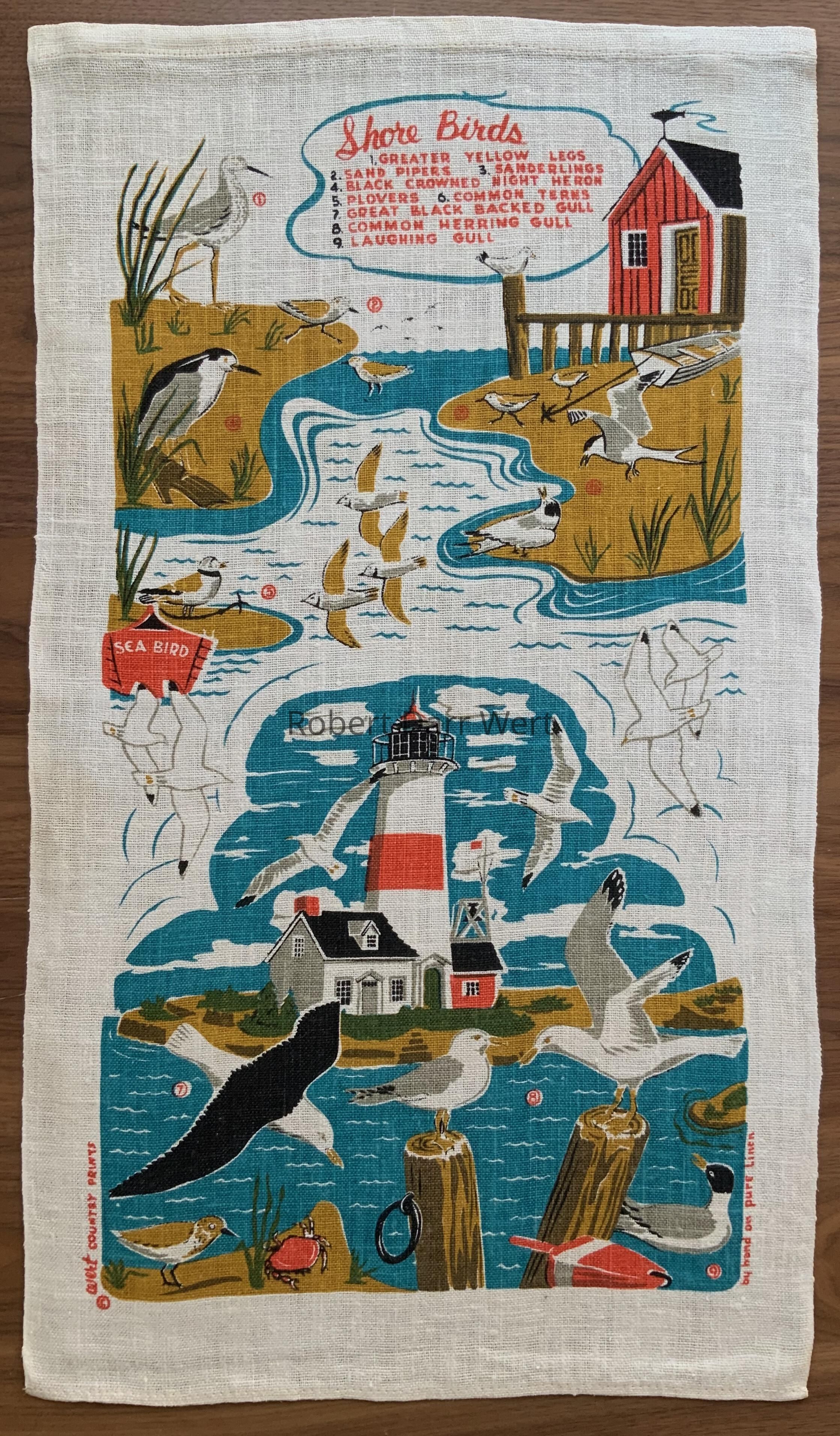 A seven-color silkscreen print on off-white linen depicting marine birds in shore settings. The nine types of birds are keyed to a list at the head of the composition next to a fisherman’s shack. Below, gulls and plovers circle a red and white striped lighthouse.
