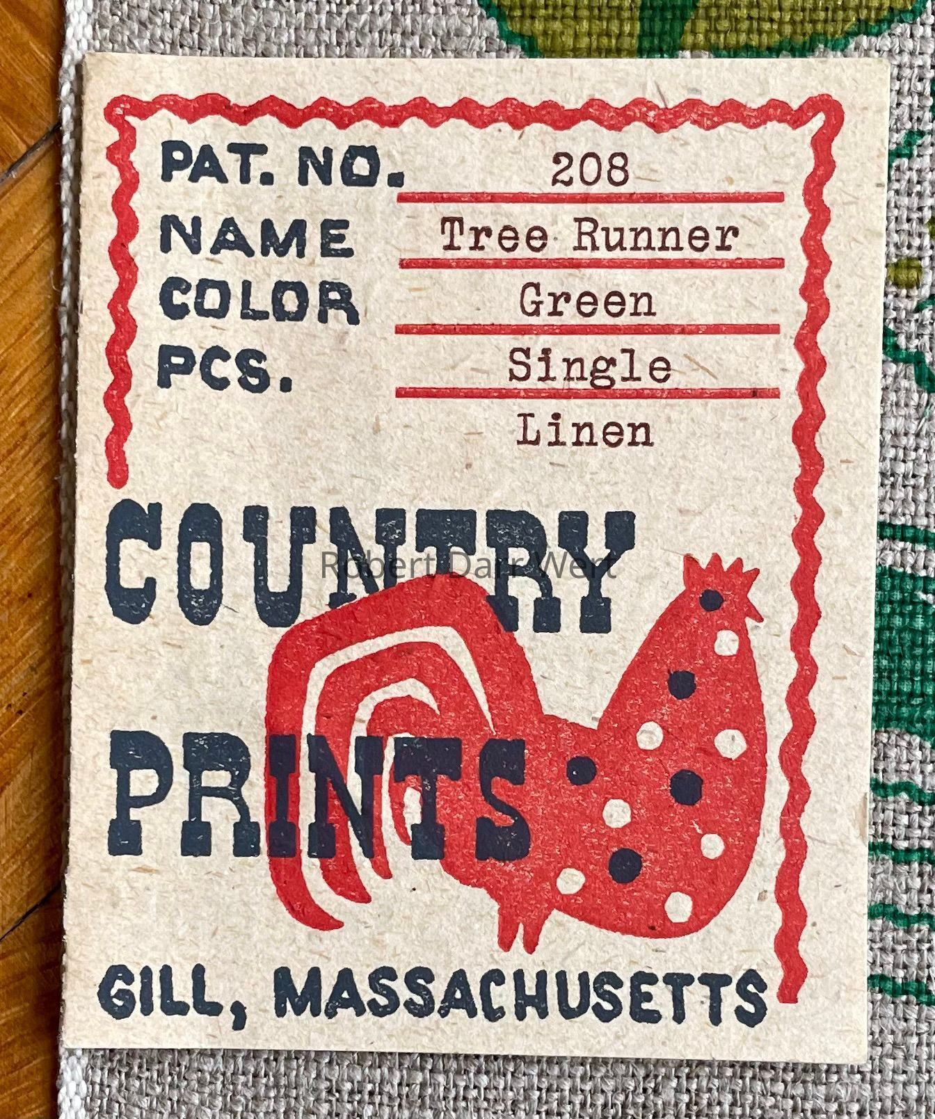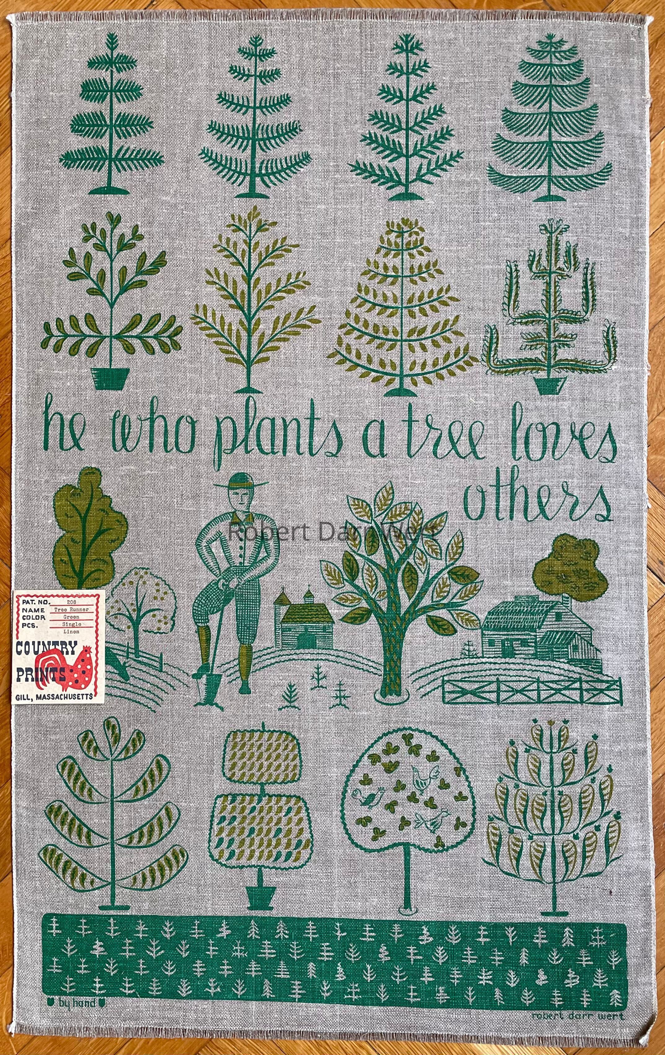 A c.1955 Country Prints price list describes this towel/runner, “He Who Plants a Tree Loves Others. Red, Green or Blue on white.”