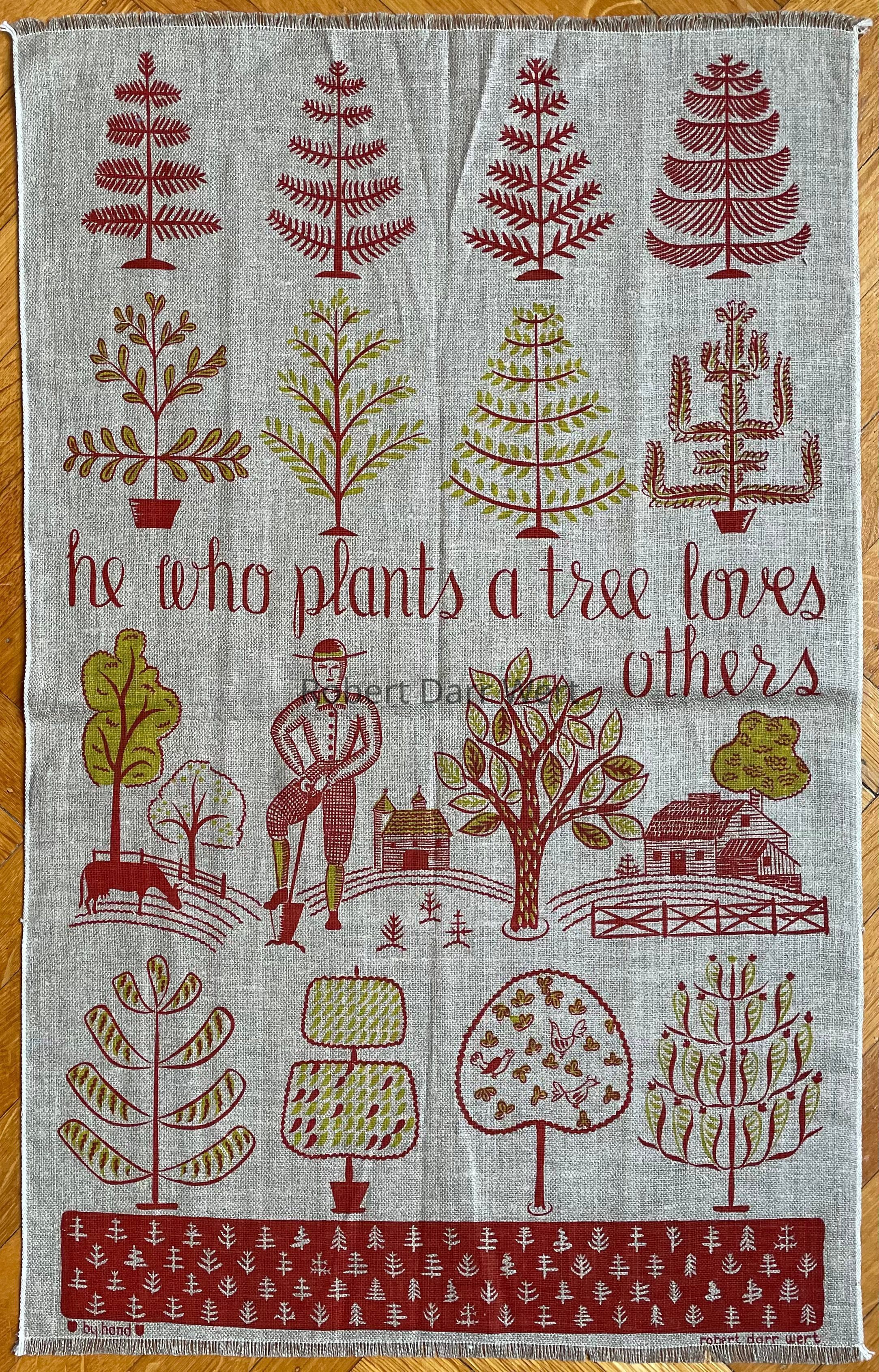 A c.1955 Country Prints price list describes this towel/runner, “He Who Plants a Tree Loves Others. Red, Green or Blue on white.”