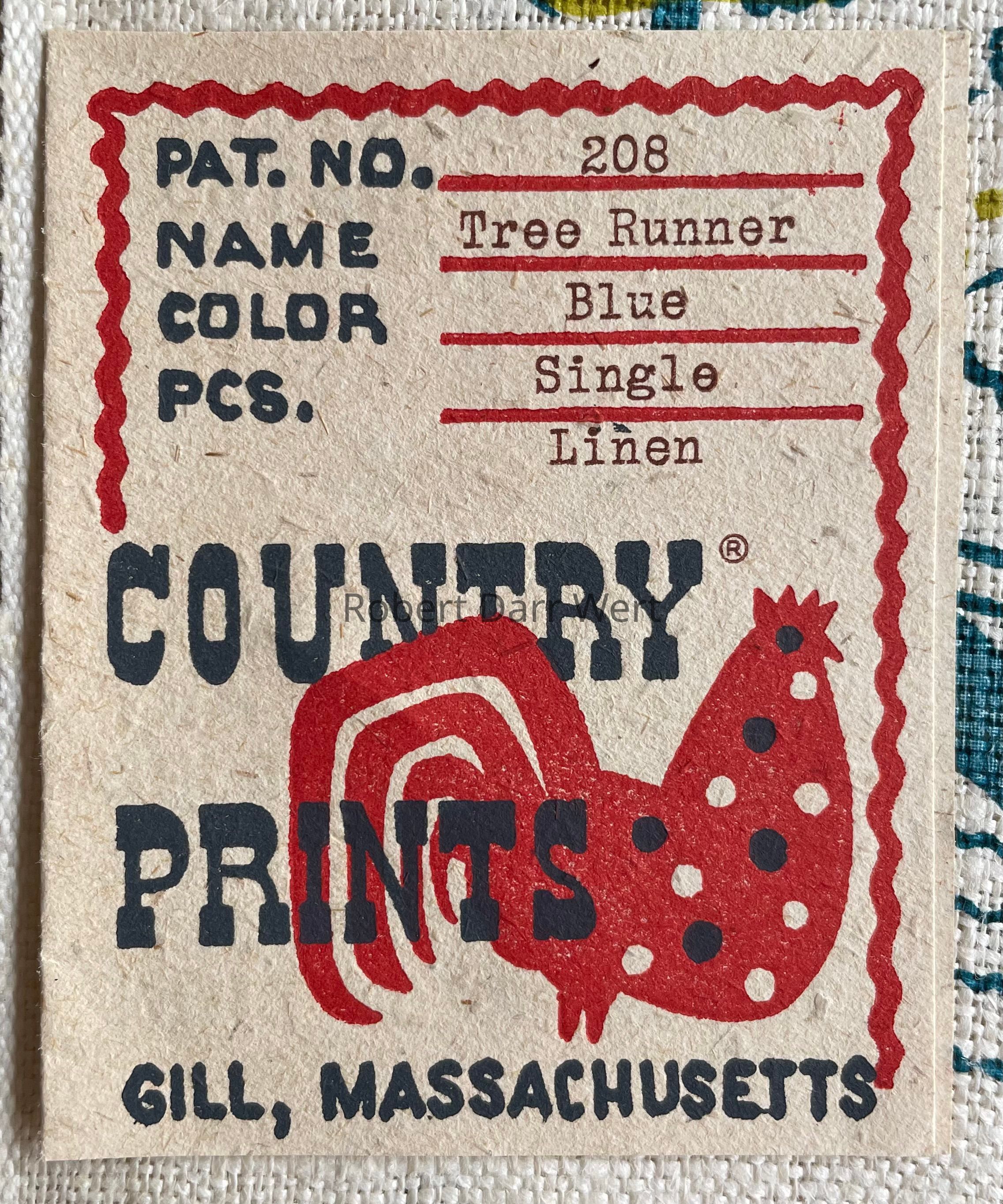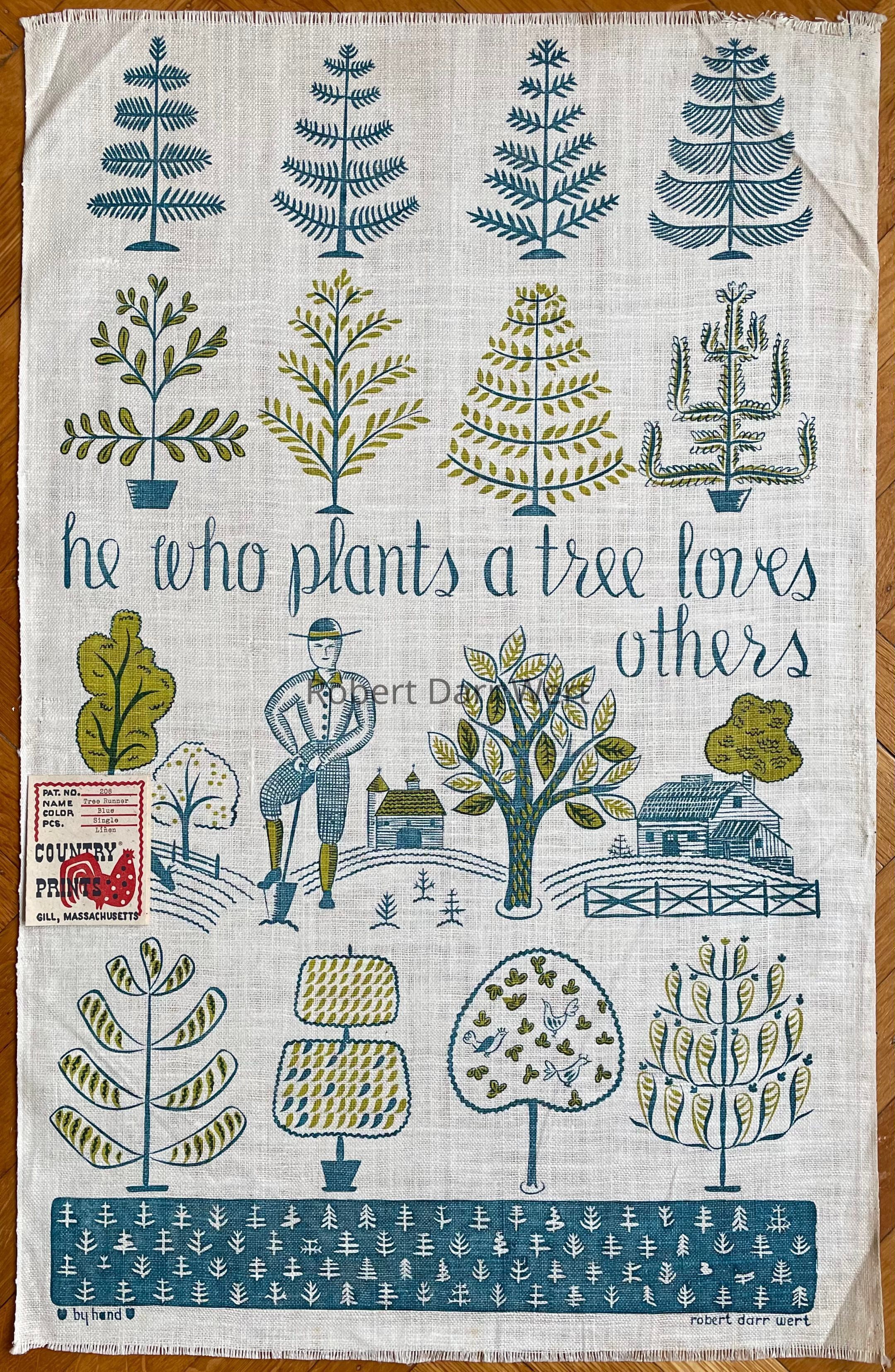 A c.1955 Country Prints price list describes this towel/runner, “He Who Plants a Tree Loves Others. Red, Green or Blue on white.”
