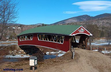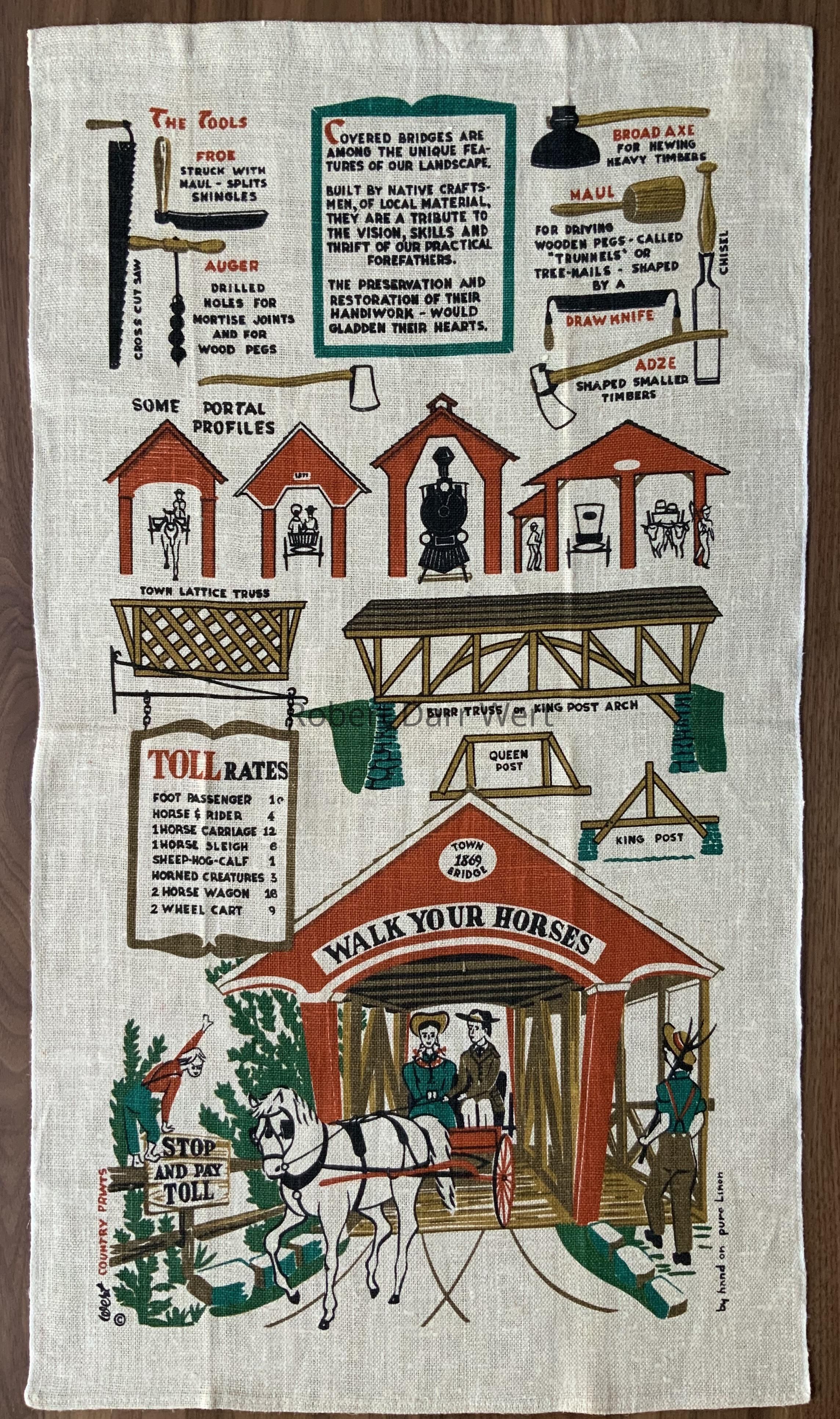 A five-screen/six-color silkscreen print on natural linen depicting covered bridges, bridge structures, and the tools used to build them.