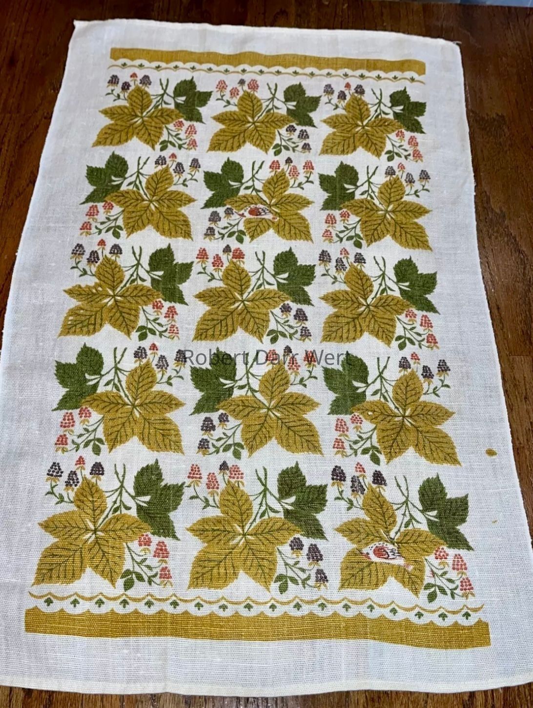 This towel/wallhanging is listed in three colorways (green, blue, or gold) on the Spring 1967 list “Additions to the Country Prints Line”. The artwork for this design was developed by an unidentified freelance artist after Robert Darr Wert’s death in January 1966. It is signed with the initials BA (Betty A____).