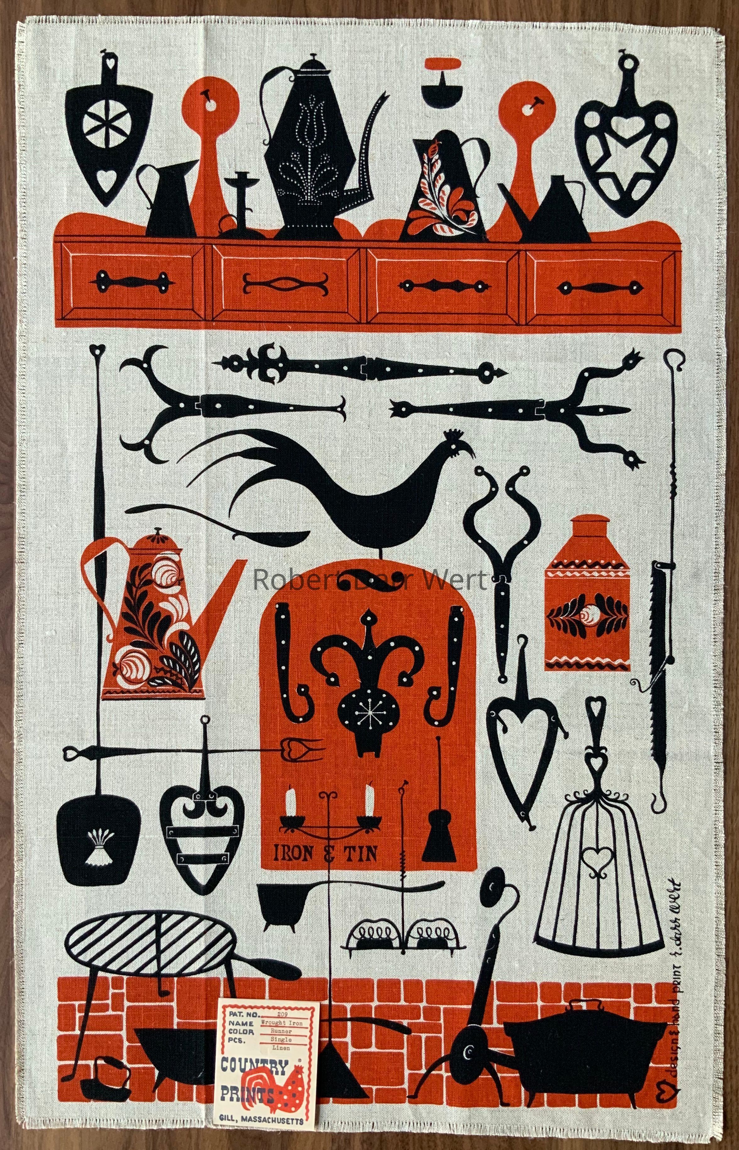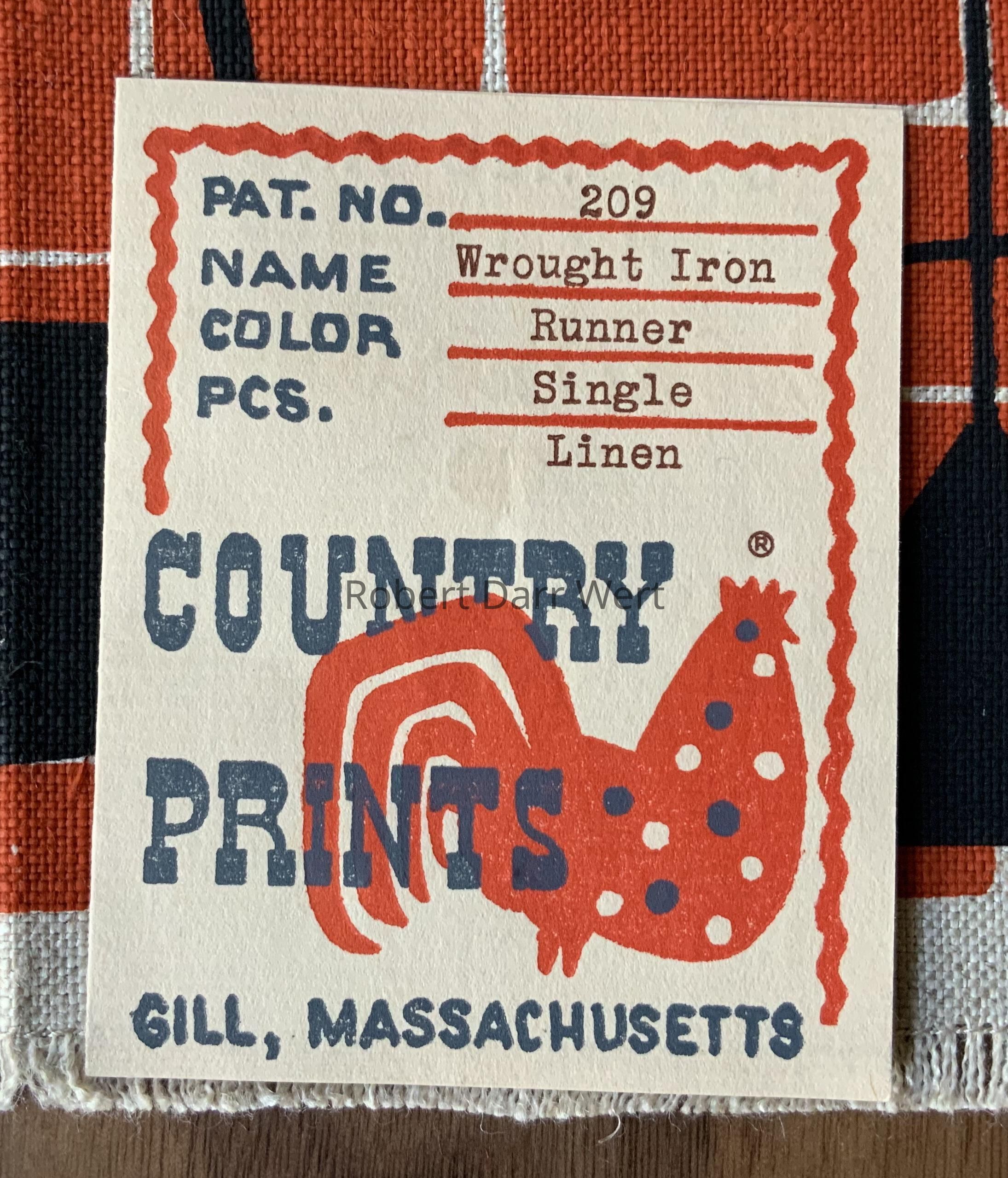 This print was marketed for use as a kitchen towel, wallhanging, or table runner, and is listed in a c.1955 Country Prints price list, “Brick Red and Black on natural.” The supplementary price list of the same year states, “the Wrought Iron runner has been very much revised” (which is this version).
