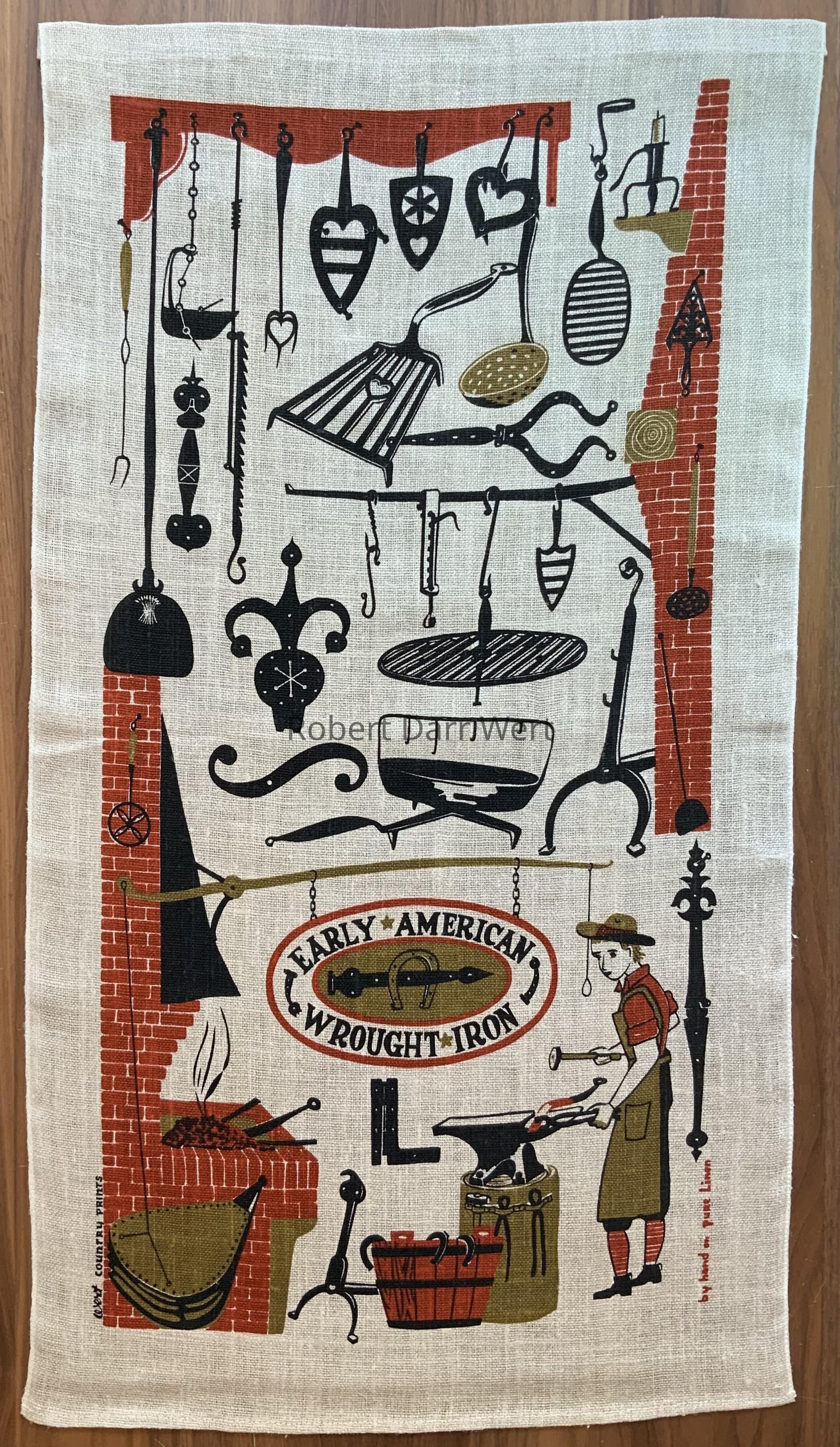 A three-color silkscreen print on natural linen depicting a young blacksmith, his workshop, and finished wrought iron hardware and kitchenware.