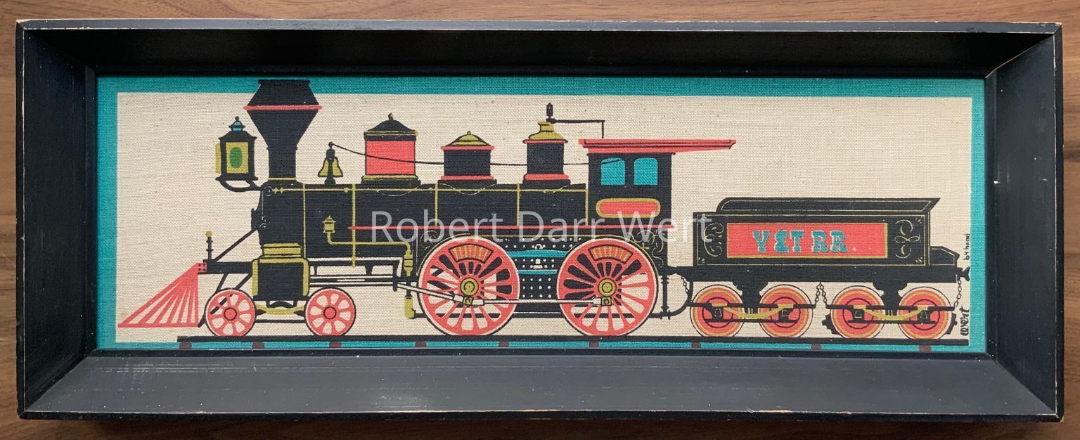 A four-color silkscreen print on linen burlap depicting a steam powered train engine and tender for the Virginia & Truckee Railroad (V&T RR). The composition is finished with a printed border.