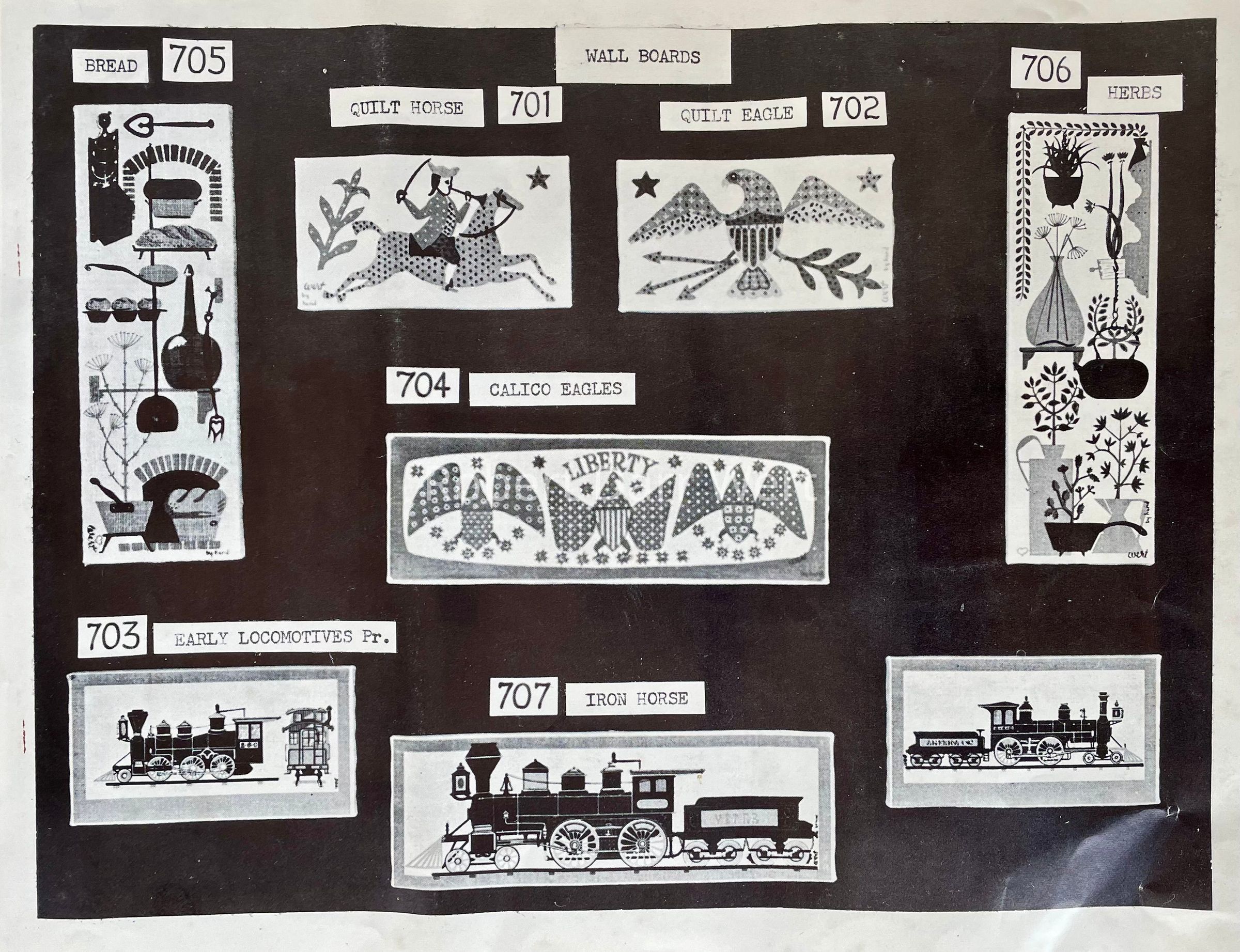 This Wall Board is listed in the January 1960 Country Prints price list, and appears in the brochure “Country Prints in Frames designed by Robert Darr Wert”, c.1960. It was also produced as a framed print, Iron Horse 618-3; see images.Made/Created
