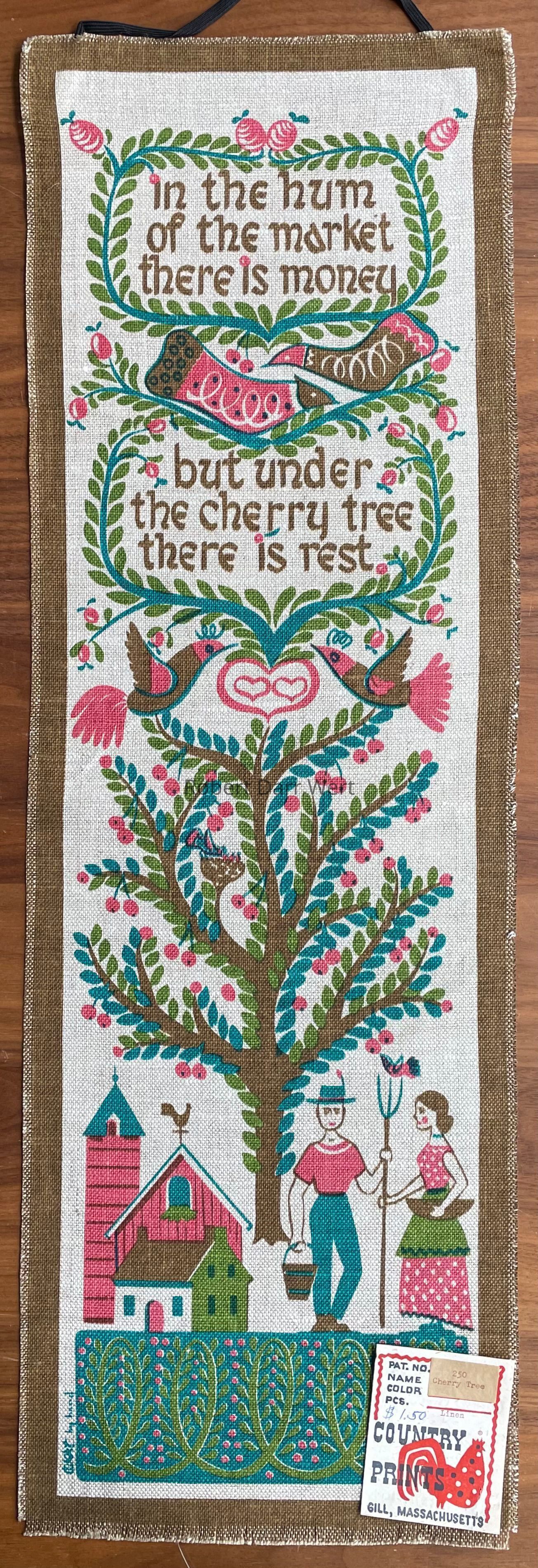 A four-color silkscreen print on linen depicting fruiting trees, a country couple, farm buildings, birds and the Japanese proverb, “In the hum of the market there is money but under the cherry tree there is rest”.