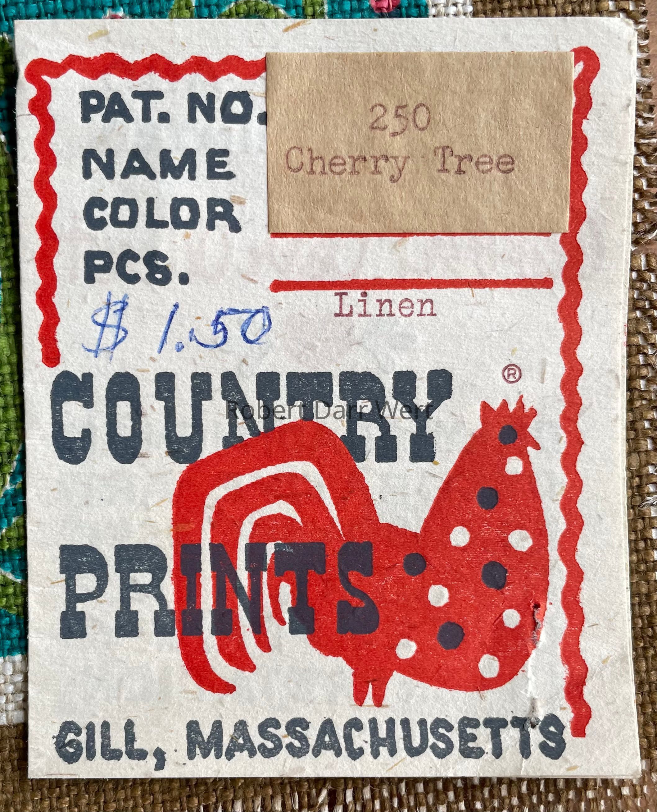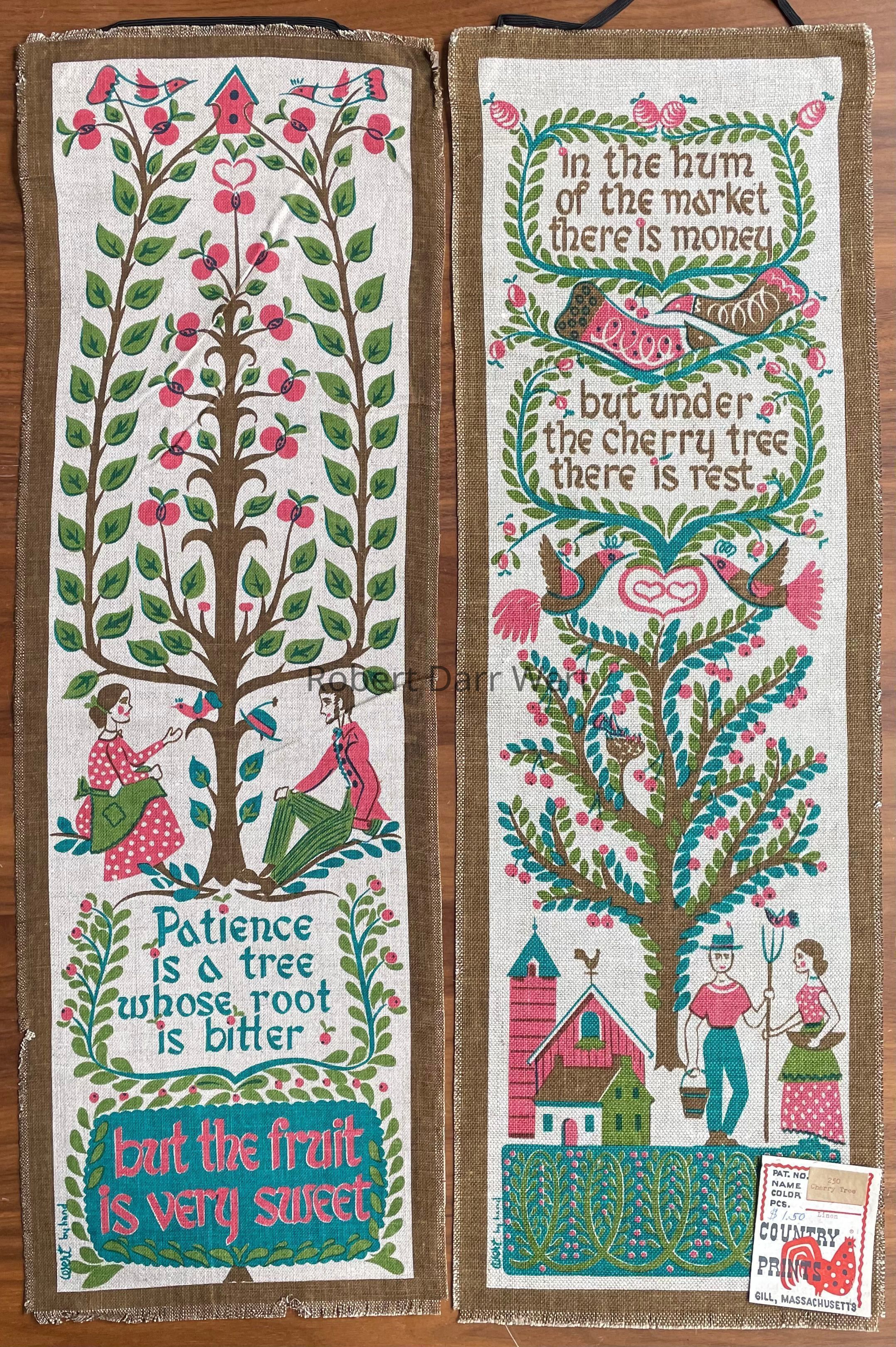 This wallhanging is listed in the January 1960 Country Prints price list (with a stick/string, and plastic gift box), and appears in the brochure “Mat Sets by Robert Darr Wert/Country Prints”, c.1960; and is a pair with Patience Tree 251; see images. It was also produced as a framed print.Made/Created