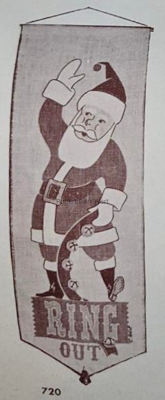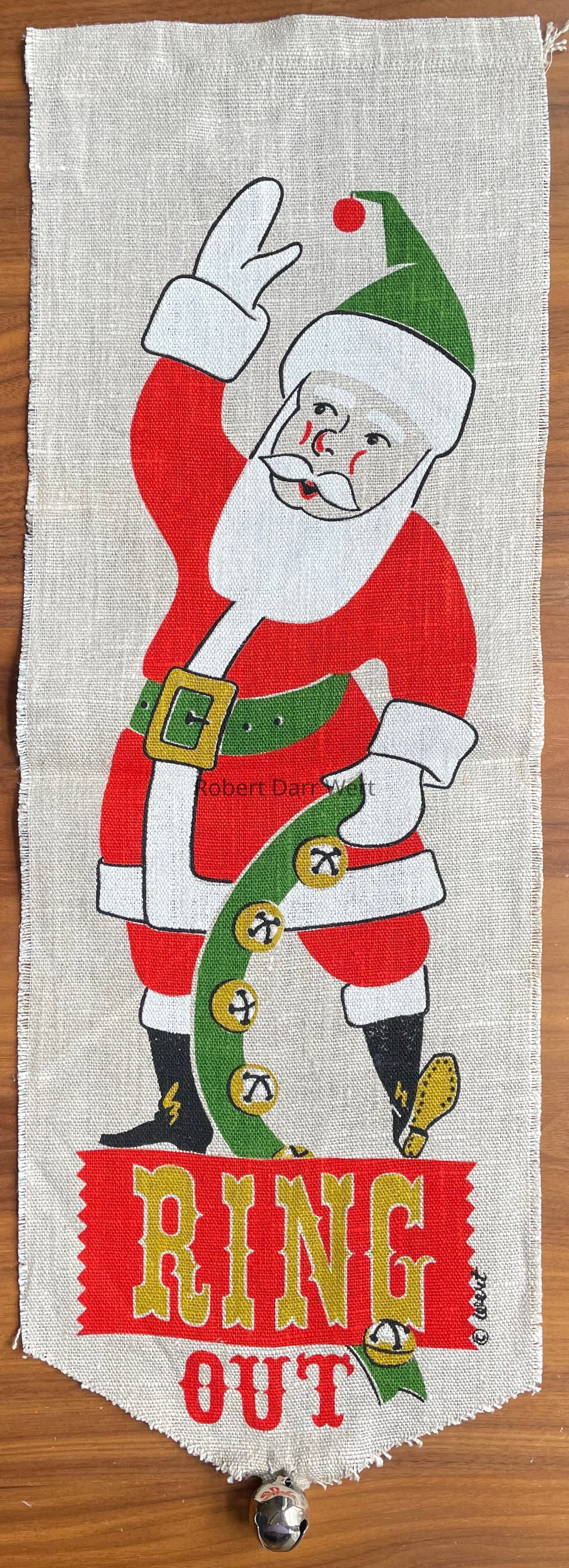 A Christmas wallhanging with a silkscreen print on linen depicting a standing Santa Claus waving his right hand and holding a strap of sleigh bells in his left. Santa stands above the phrase, “Ring Out”. The lower end of the wallhanging is cut to a “V” point. A silver jingle bell is mounted at the point.