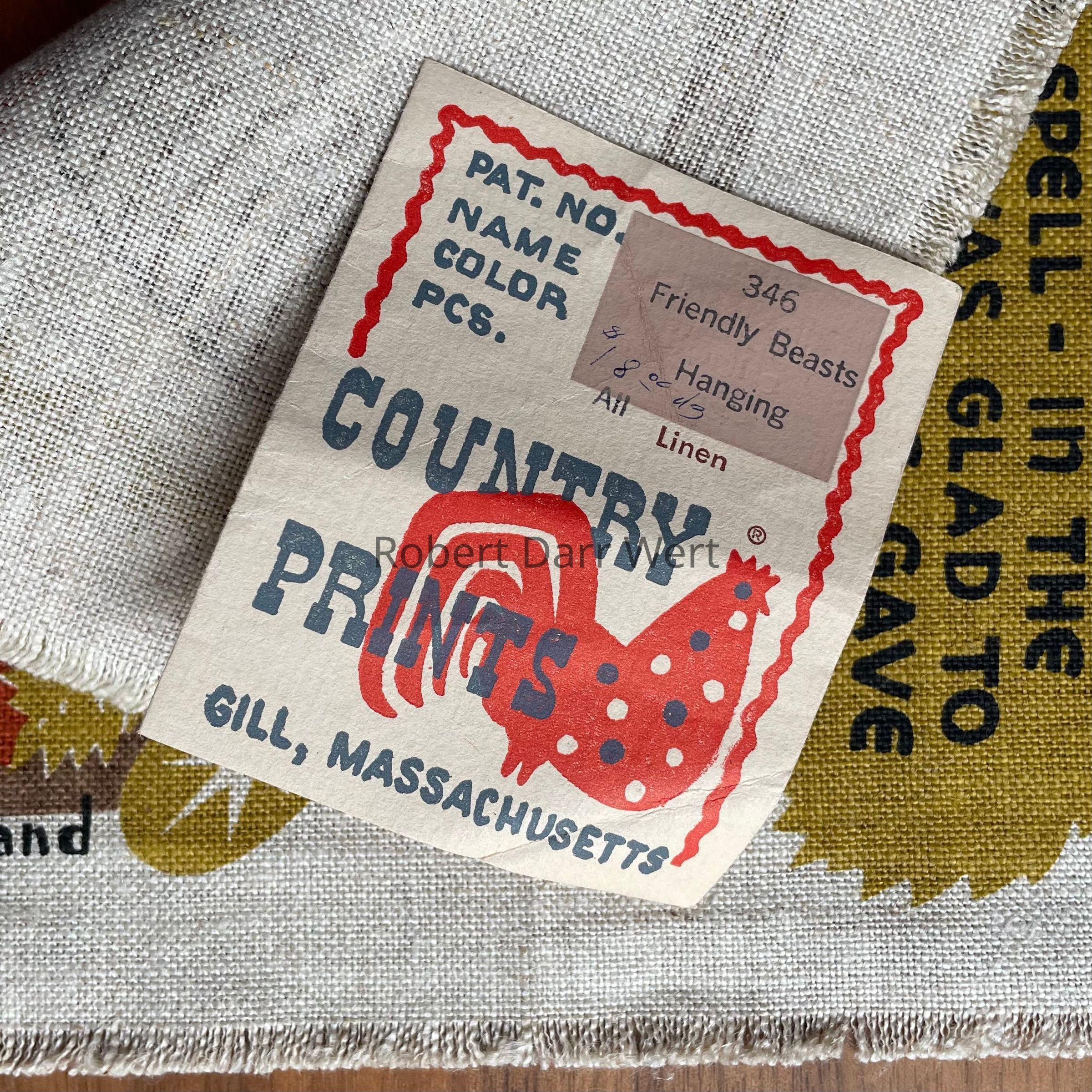 A wallhanging with a three-screen/four-color silkscreen print on off-white linen depicting verses from the Christmas song, “The Friendly Beasts”, telling the Christmas story from the point of view of the animals living in the barn where Jesus was born.