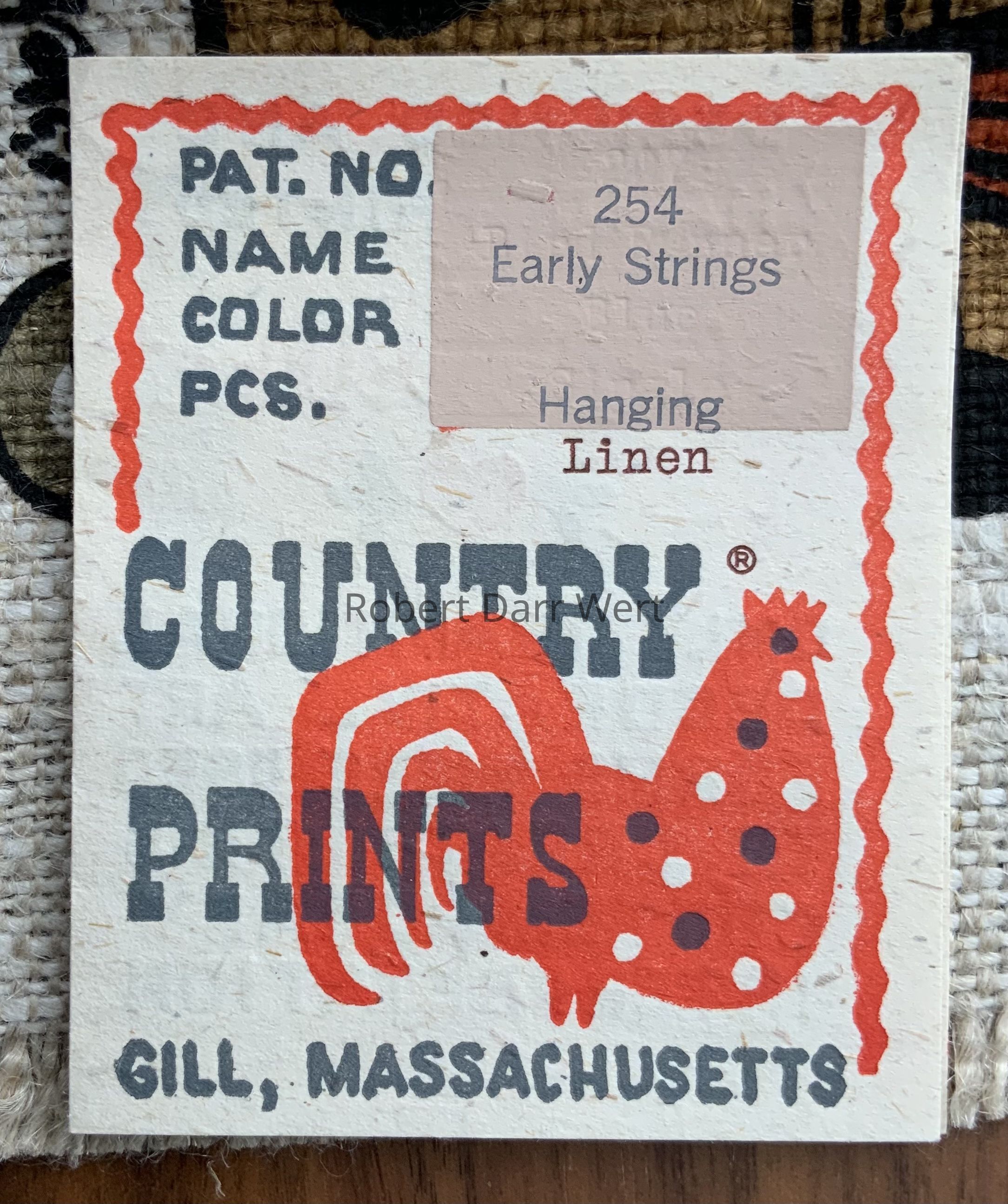 This wallhanging is listed in the January 1960 Country Prints price list (with a stick/string, and plastic gift box), and appears in the brochure “Mat Sets by Robert Darr Wert/Country Prints”, c.1960.