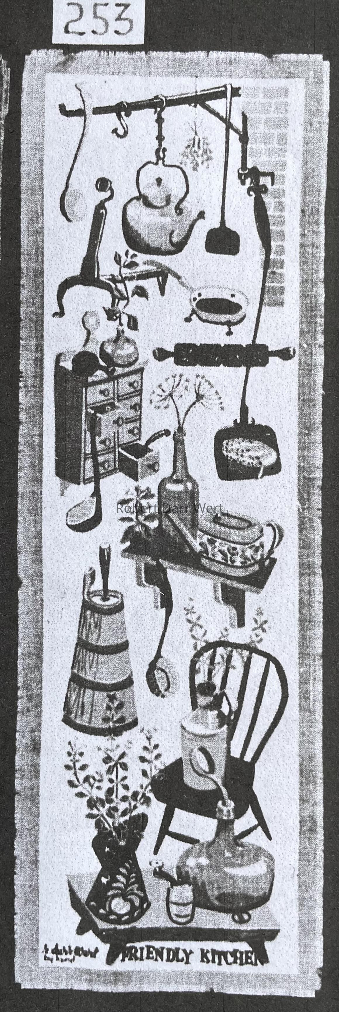 This wallhanging is listed in the January 1960 Country Prints price list (with a stick/string, and plastic gift box), and appears in the brochure “Mat Sets by Robert Darr Wert/Country Prints”, c.1960. It is a pair with A Few Herbs 254; see images. It was also available as a framed print.Made/Created