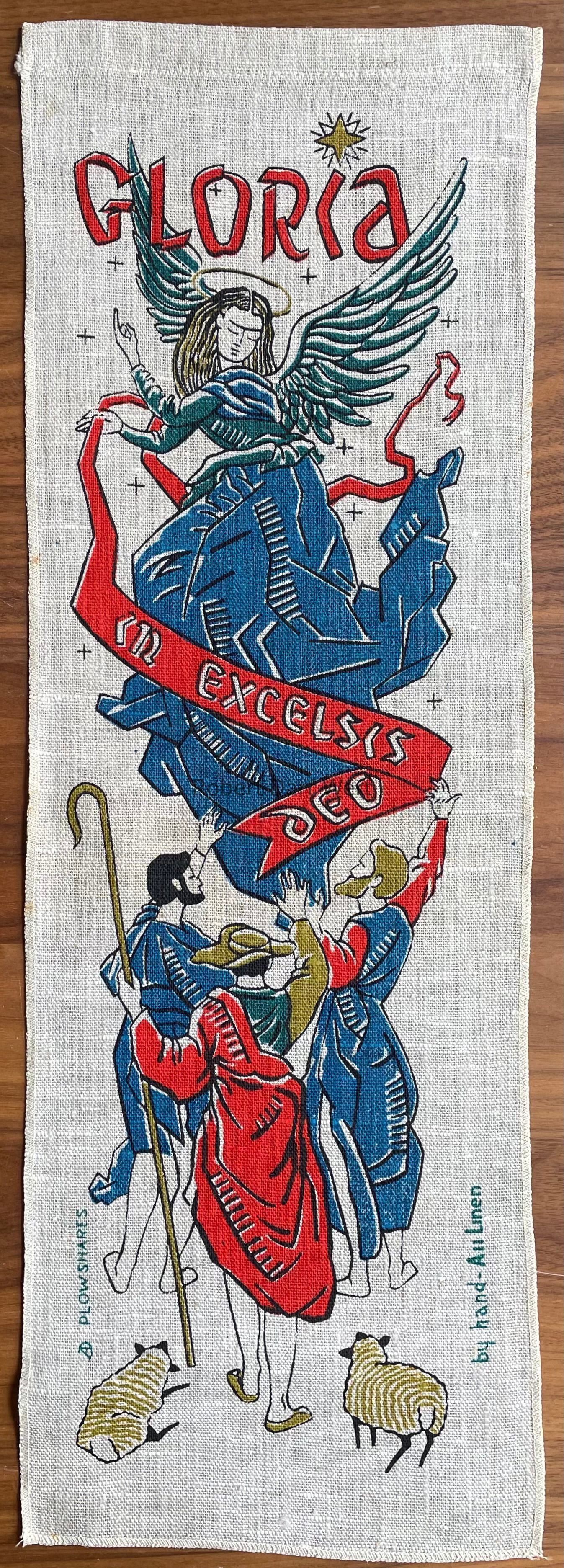 A Plowshares wallhanging with a five-color silkscreen print on natural linen depicting the word “Gloria” above an angel hovering above three shepherds and their sheep while holding a furling banner emblazoned with the the latin phrase, “in excelsis deo” from the Christian hymn known as the Angelic Hymn; see web link.