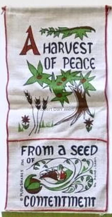 A Plowshares wallhanging developed by a freelance artist and produced by Country Prints after Wert’s death in January 1966. Though designed to blend with Wert’s catalog of work, the initials “BE” mark this as the work of an unidentified artist.