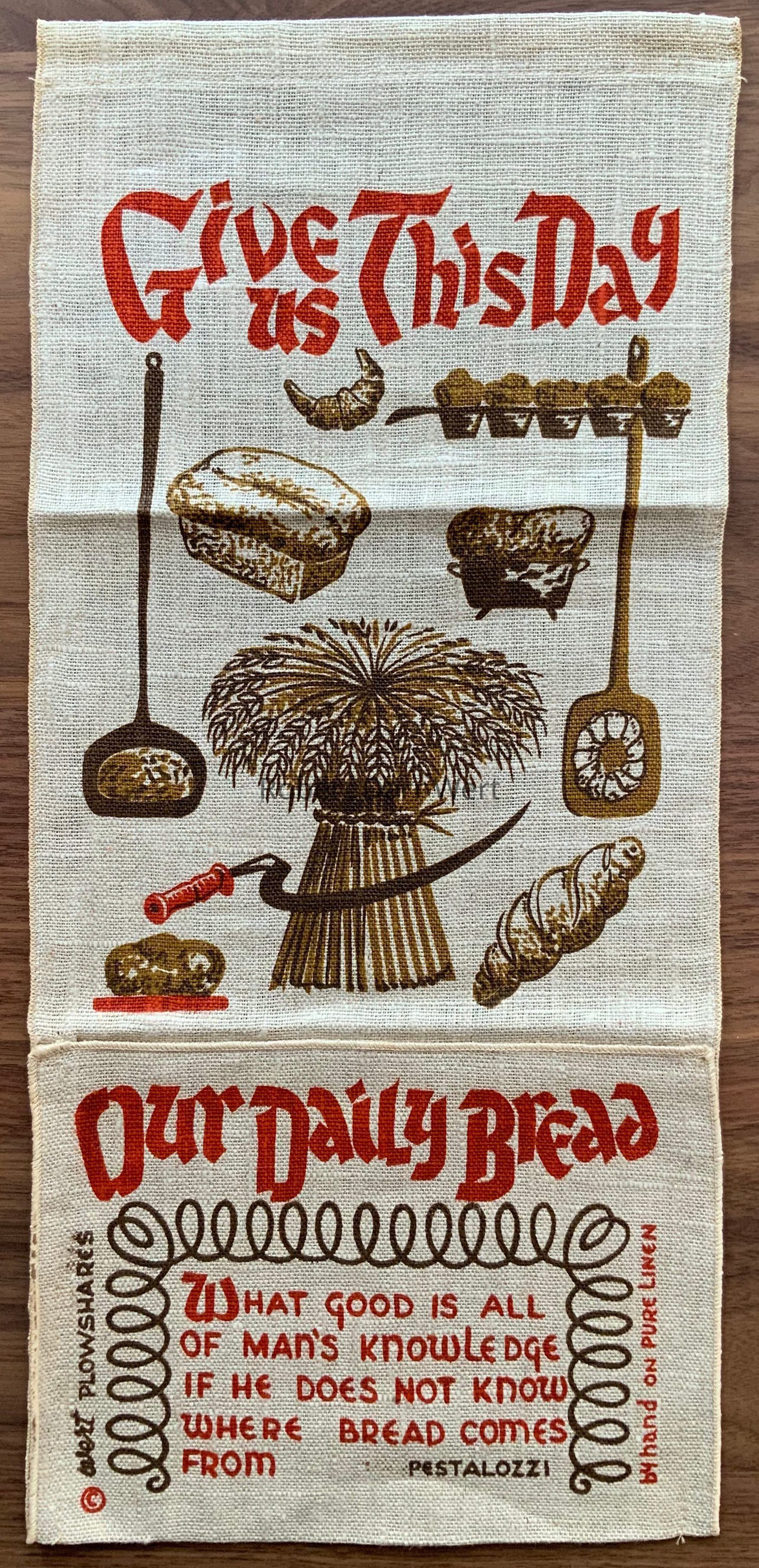 An excerpt from the Lord’s Prayer, “Give Us This Day Our Daily Bread”, is paired with a quote from Pestalozzi, “WHAT GOOD IS ALL OF MAN’S KNOWLEDGE IF HE DOES NOT KNOW WHERE BREAD COMES FROM”.