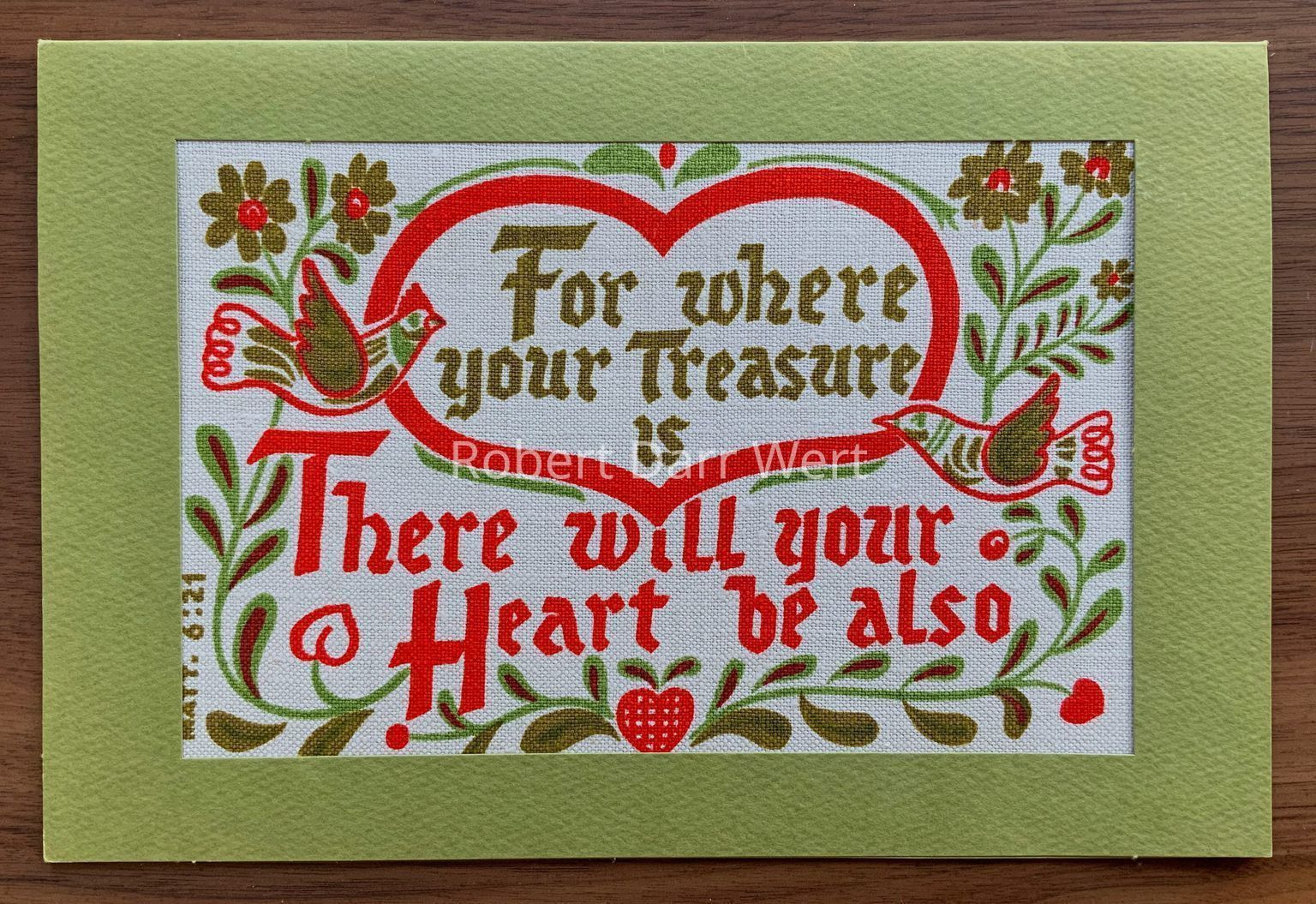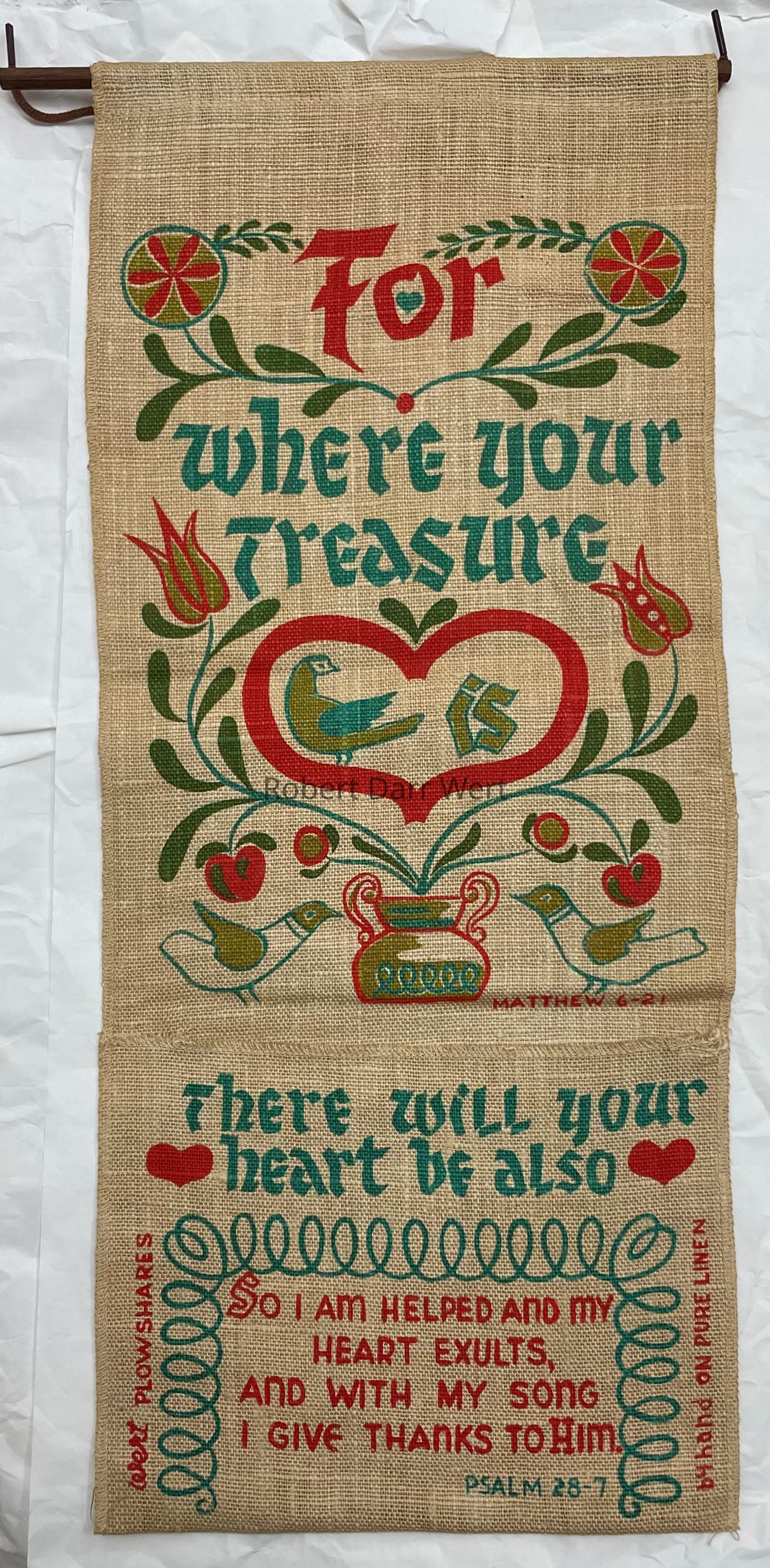 A Plowshares Kitchen Pocket wallhanging with a four-color silkscreen print on natural linen depicting Wert’s interpretation of Pennsylvania “Dutch” folk art motifs intertwined with two bible verses, Matthew 6-21 and Psalms 28-7.