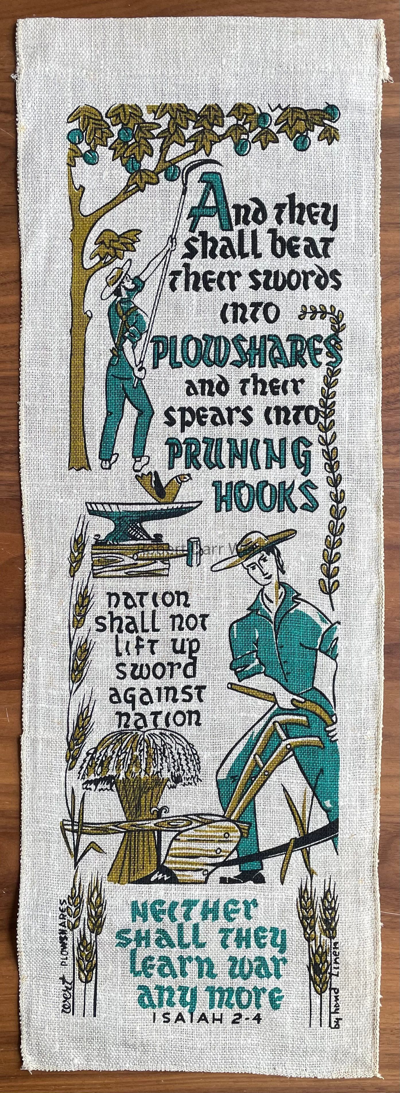 A Plowshares wallhanging with a three-color silkscreen print on natural linen depicting two farmers using wrought iron tools for harvesting apples and plowing furrows. A bird rests upon a blacksmith’s anvil and hammer. Amongst these elements appears the Bible verse Isaiah 2-4. An apple tree, a trailing vine and wheat stalks act as border elements. This print has been documented printed in three colors and four colors.