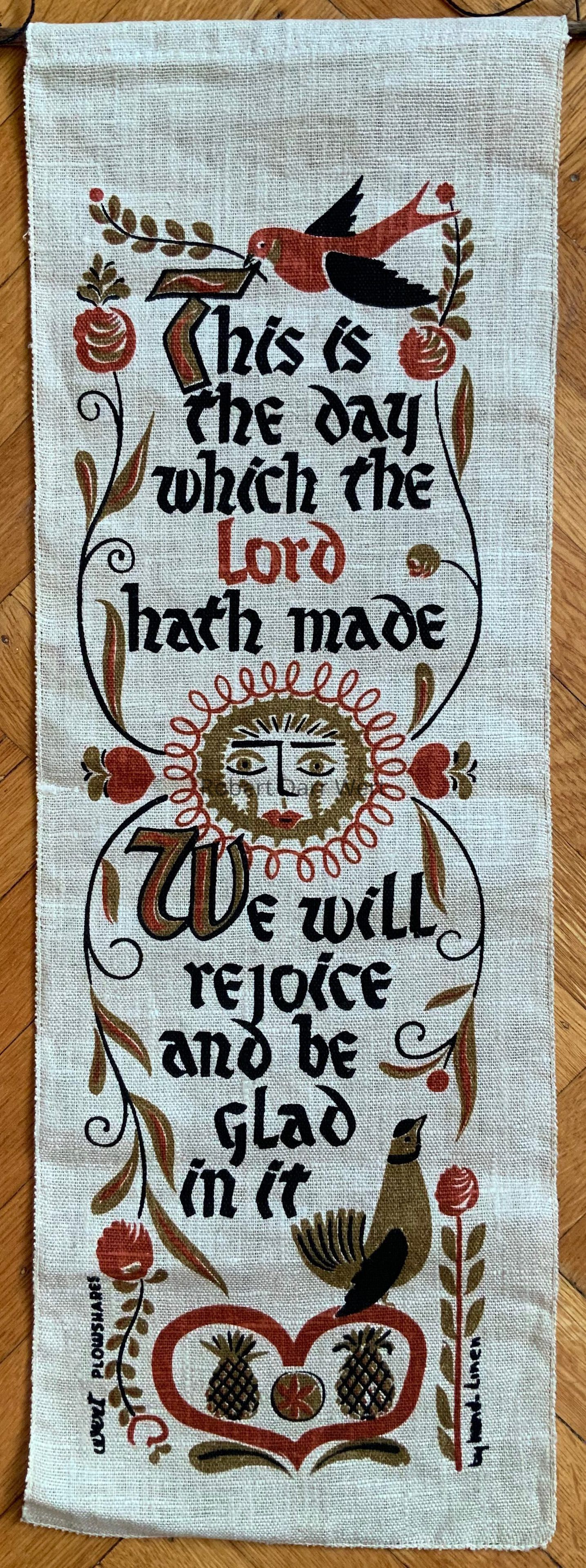 A Plowshares wallhanging with a three-color silkscreen print on natural linen depicting symbols of wealth and plenty surrounding the Bible verse Psalm 118:24, “This is the day which the Lord hath made, We will rejoice and be glad of it”.