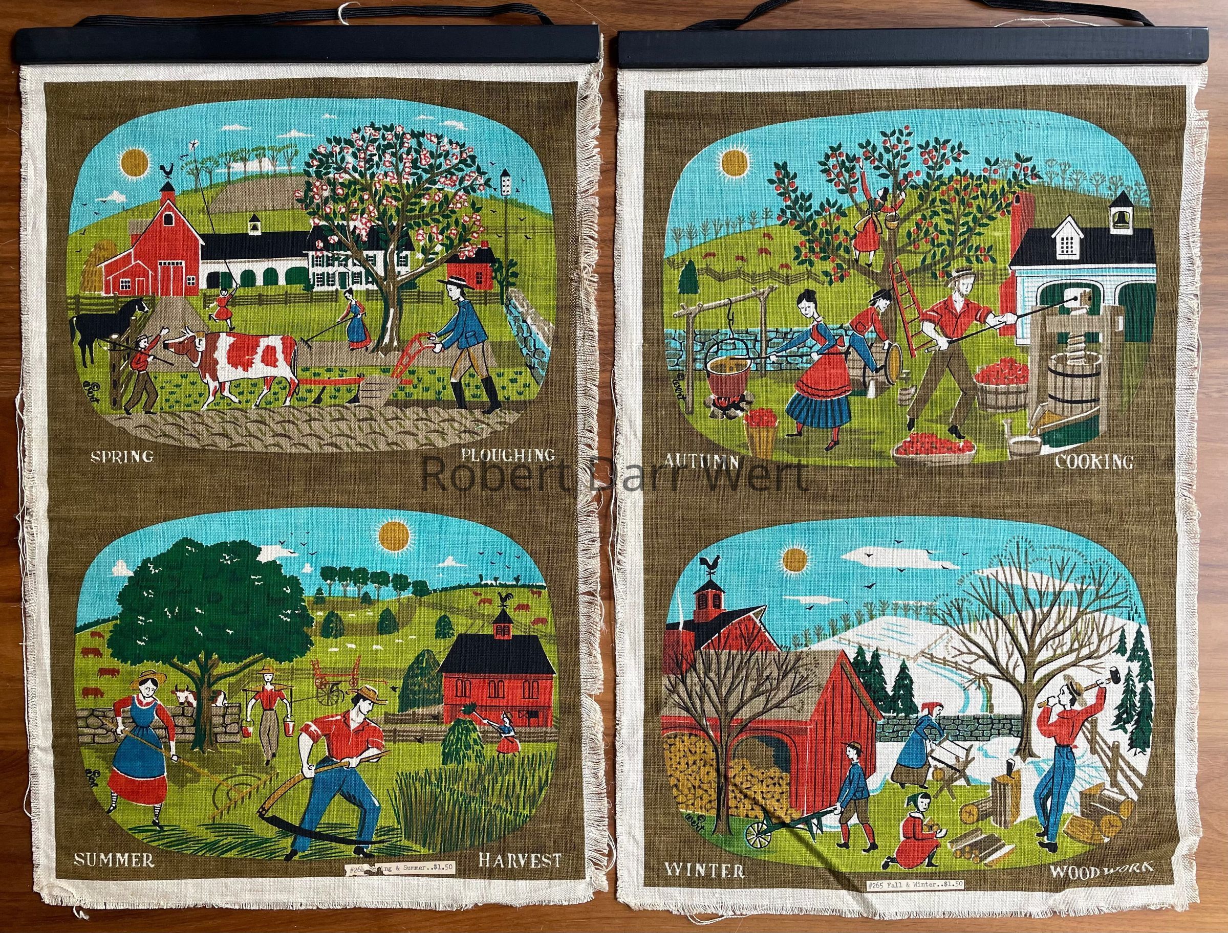 A wallhanging with an eight-color silkscreen print on white linen depicting fall and winter activities on an early American farm. This wallhanging is a pair with Spring & Summer 264. All four seasons were also produced as a set of four framed prints.