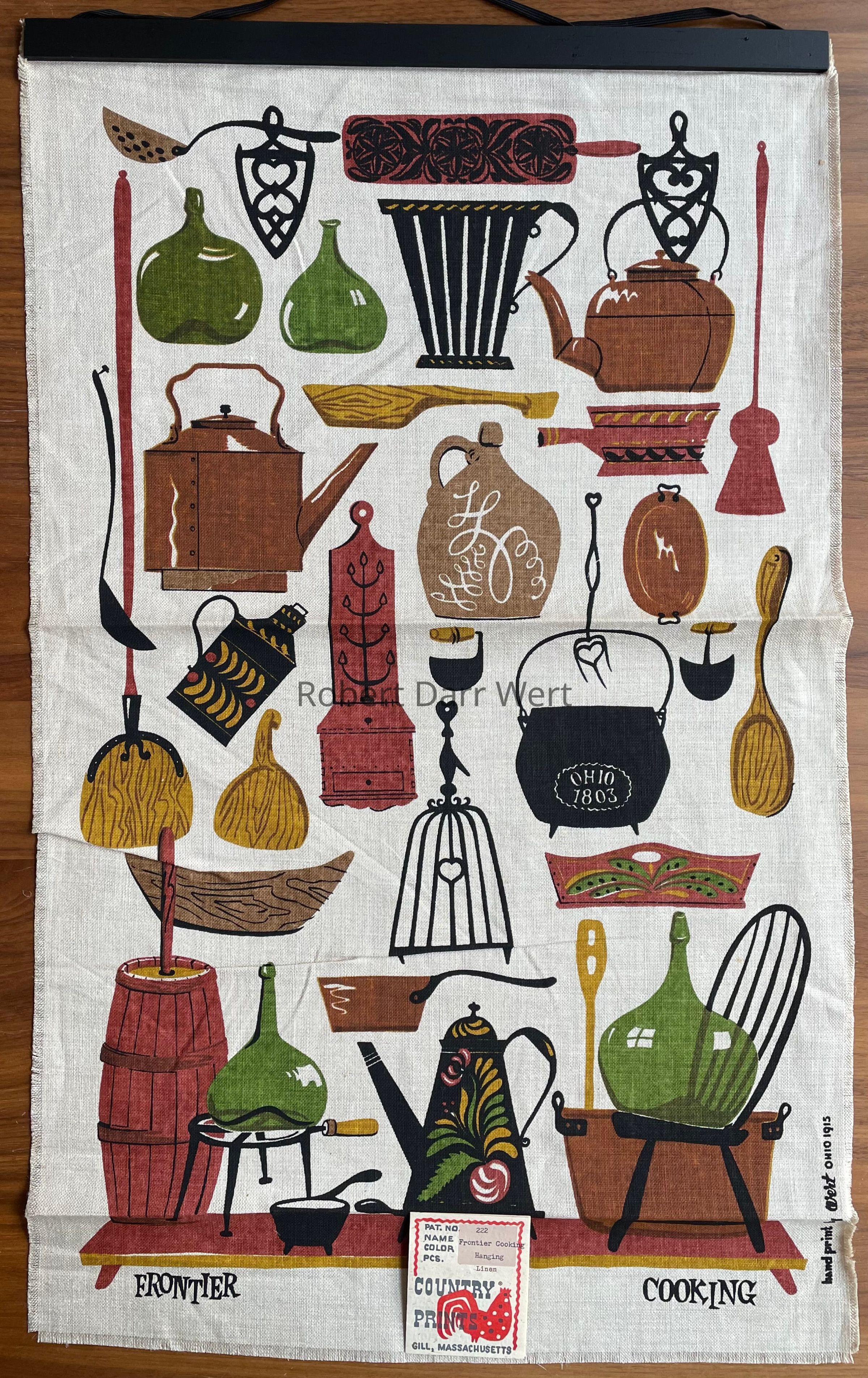 A wallhanging with a five-screen/multiple color silkscreen print on natural linen depicting more than thirty-five tools and furnishings necessary to a well equipped early American kitchen. Items illustrated include metalware, woodware, painted tin, glass and painted pine. All are recurrent themes in Wert’s work.