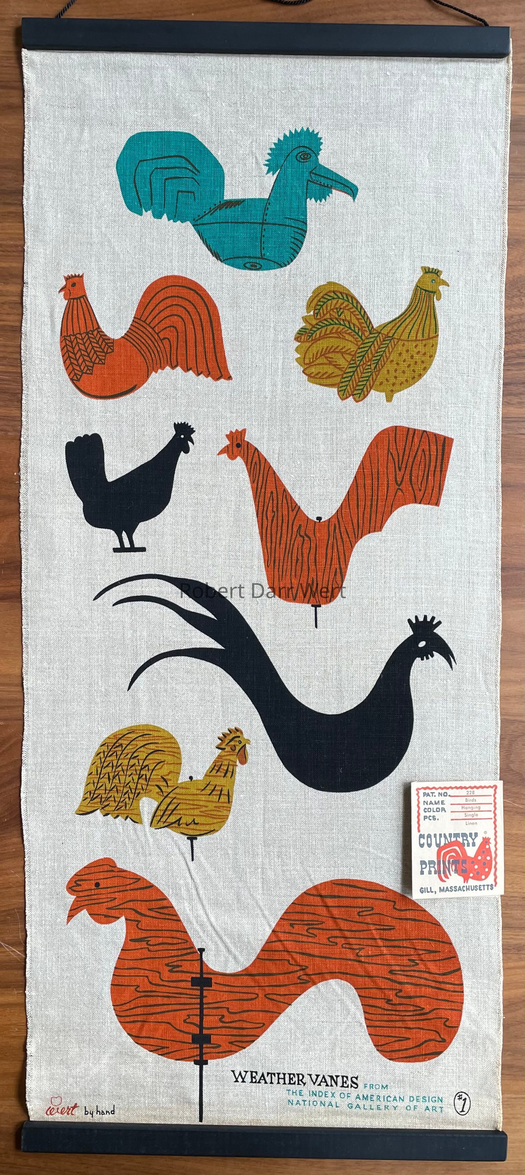 A four-color silkscreen print on natural linen depicting eight early American rooster weathervanes. The printed note at the lower margin states, “WEATHERVANES FROM THE INDEX OF AMERICAN DESIGN, NATIONAL GALLERY OF ART, #1” (#1 indicates this is one of two weathervanes wallhangings). Several of these weathervane forms are represented in other examples of Wert’s work.