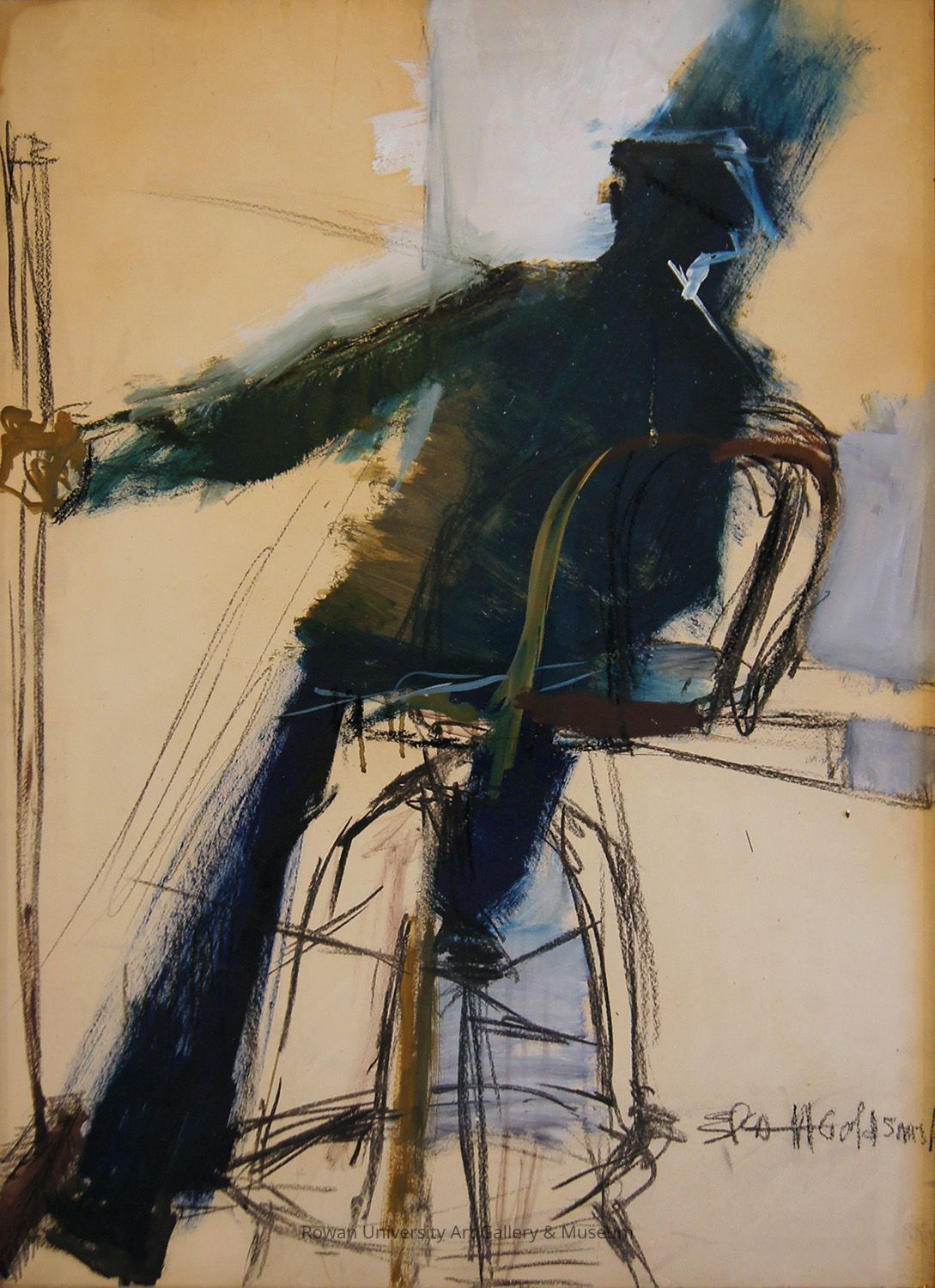 Loosely rendered representation of a man in a flat cap, jacket, and pants, seated on a stool with his back to the viewer and holding a janitorial broom; behind him are charcoal lines and flat areas of white, gray, and phthalo green to suggest an interior spaceType of Painting
