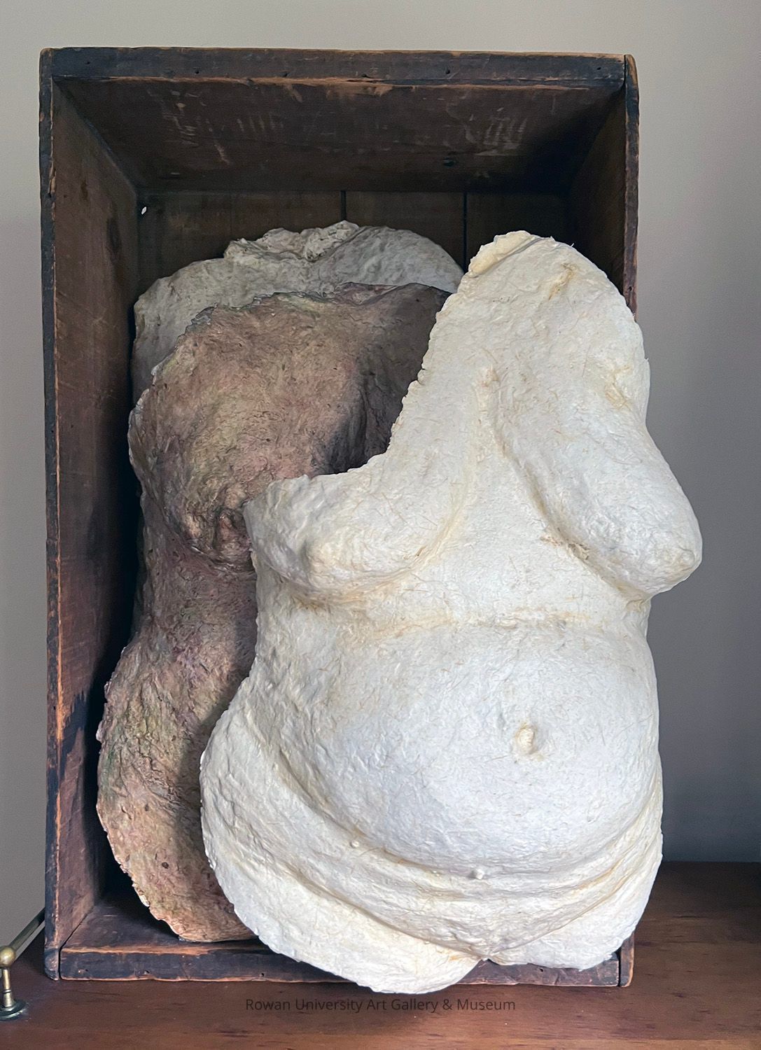 Distressed wooden crate containing three fragmentary torsos of a woman, each layered atop the previous one; the rearmost torso is gray, the middle torso is tan, and the front torso is whiteType of Sculpture