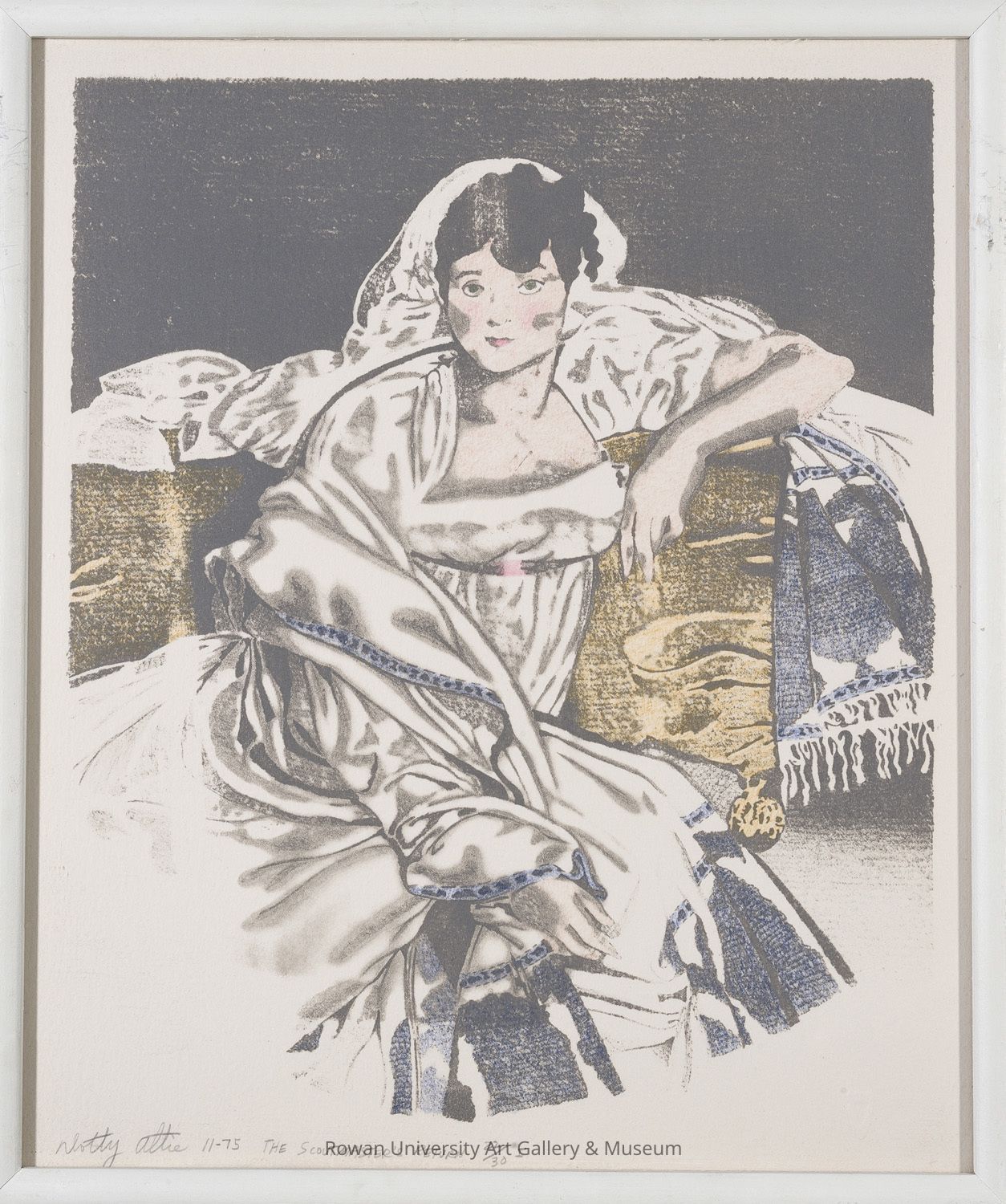 Seated woman with arm resting on the back of a sofa and dressed in a white Empire dress; after a painting by Jean-Auguste-Dominique Ingres