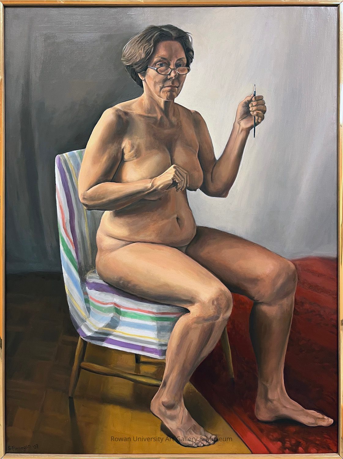 Full-length nude portrait of a woman with short brown hair and glasses, holding a paintbrush, seated on a chair covered with multicolored striped fabric, and positioned in an interior with a gray wall, parquet floor, and red rugType of Painting