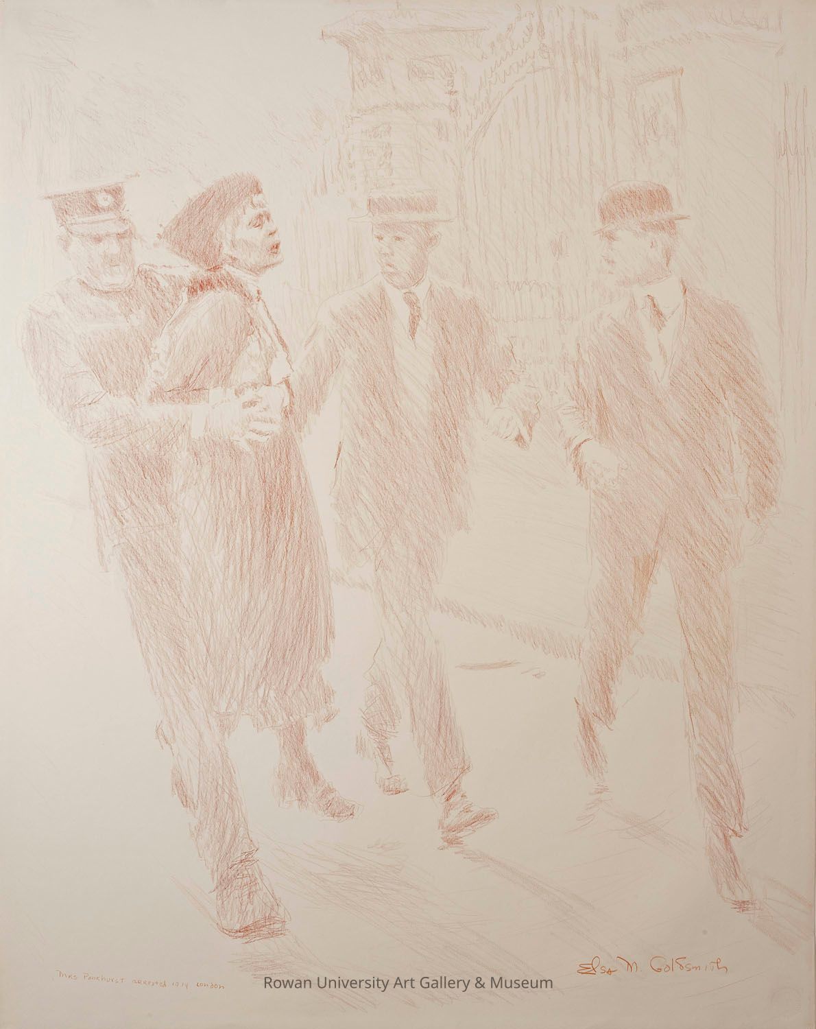 Elsa M. Goldsmith (1920–2005), Emmeline Pankhurst, from Women on the March Series, 1976–77, Conté crayon on paper, 29 x 23 in. Rowan University Art Gallery & Museum, Gift of Cris and Jo Ann Goldsmith (2021.66.4). Photo: Karen Mauch Photography.
