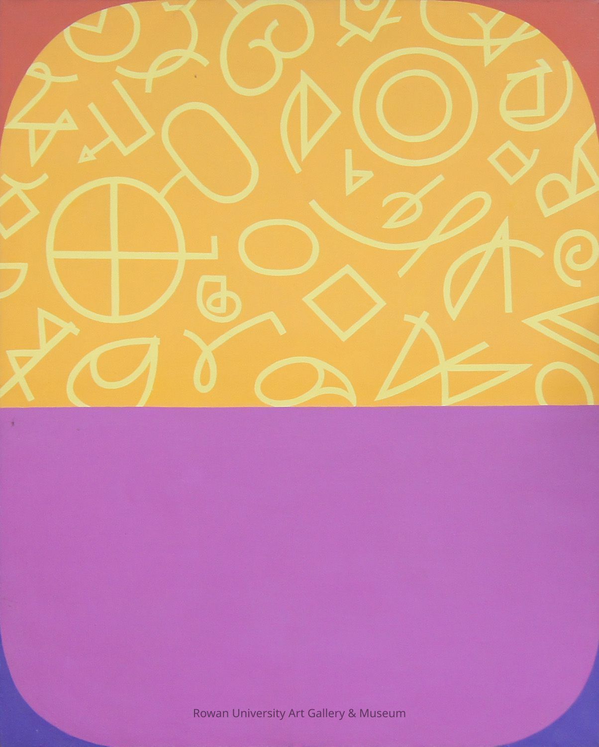 Abstract composition divided vertically into two smaller rectangles; in the upper rectangle, a large yellow-orange shape with curved upper corners contains an arrangement of angular and curvilinear red forms that resemble writing; in the lower rectangle is a large violet shape with curved lower corners; the upper corners are red; the lower corners are blue-violet