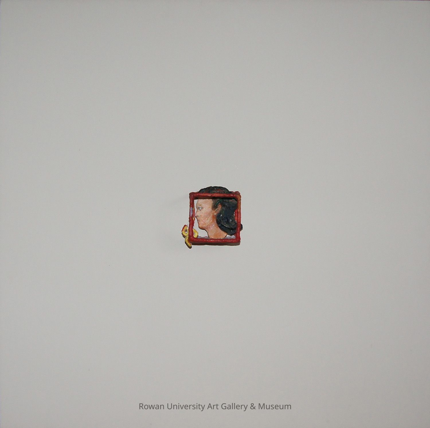 Mixed media composition consisting of a large square canvas, painted entirely in white, with a small profile head enclosed in a cubic structure at the centerArtwork Details