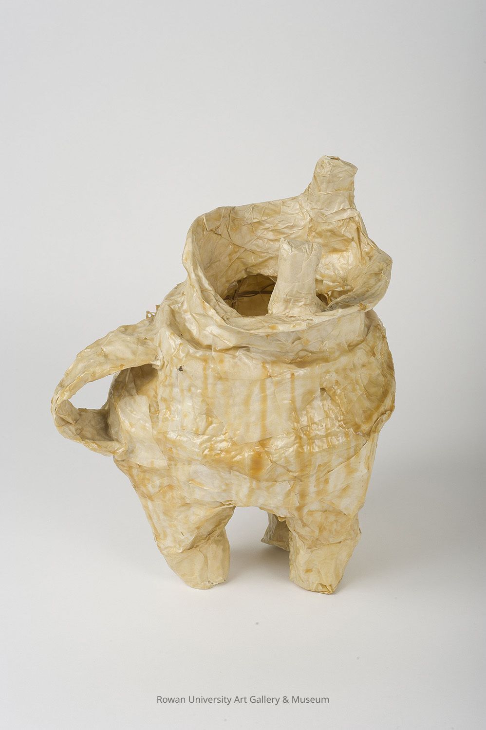 Sculpture in the form of a vessel with a bulbous body supported by three legs, with a short neck, wide lip, and circular opening between two vertical projections at the topType of Sculpture