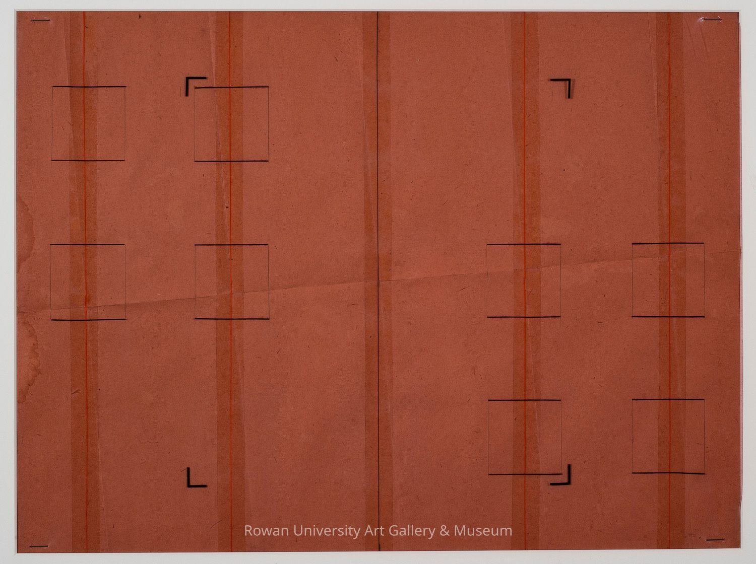 Cecile Abisn (b. 1930), Study for Declination, 1975, Kraft paper, graphite, clear adhesive tape, vinyl, black marker, and staples on corrugated cardboard, 15 x 20 in. Rowan University Art Gallery & Museum, Sylvia Sleigh Collection (2011.1). Photo: Karen Mauch Photography.