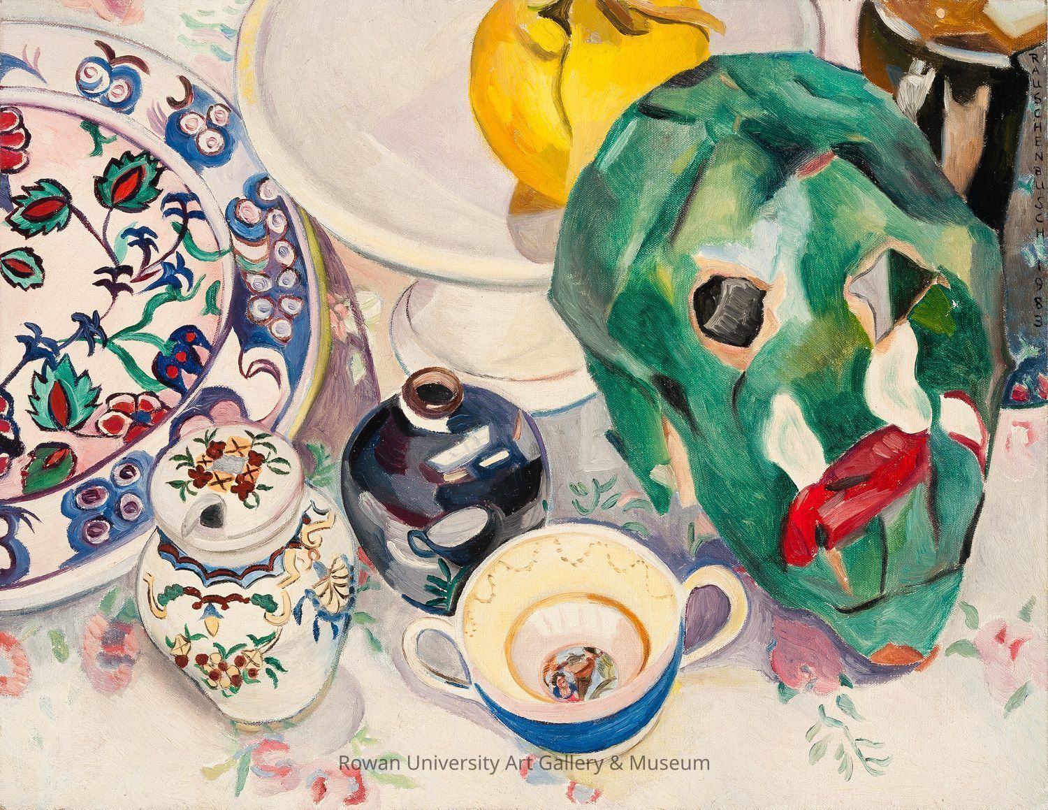 Still life of a plate decorated with floral and other motifs, a yellow object atop a cake stand, lidded sugar bowl, reflective ceramic vase, two-handled sugar bowl, green papier-mâché mask, and a truncated brown vesselType of Painting