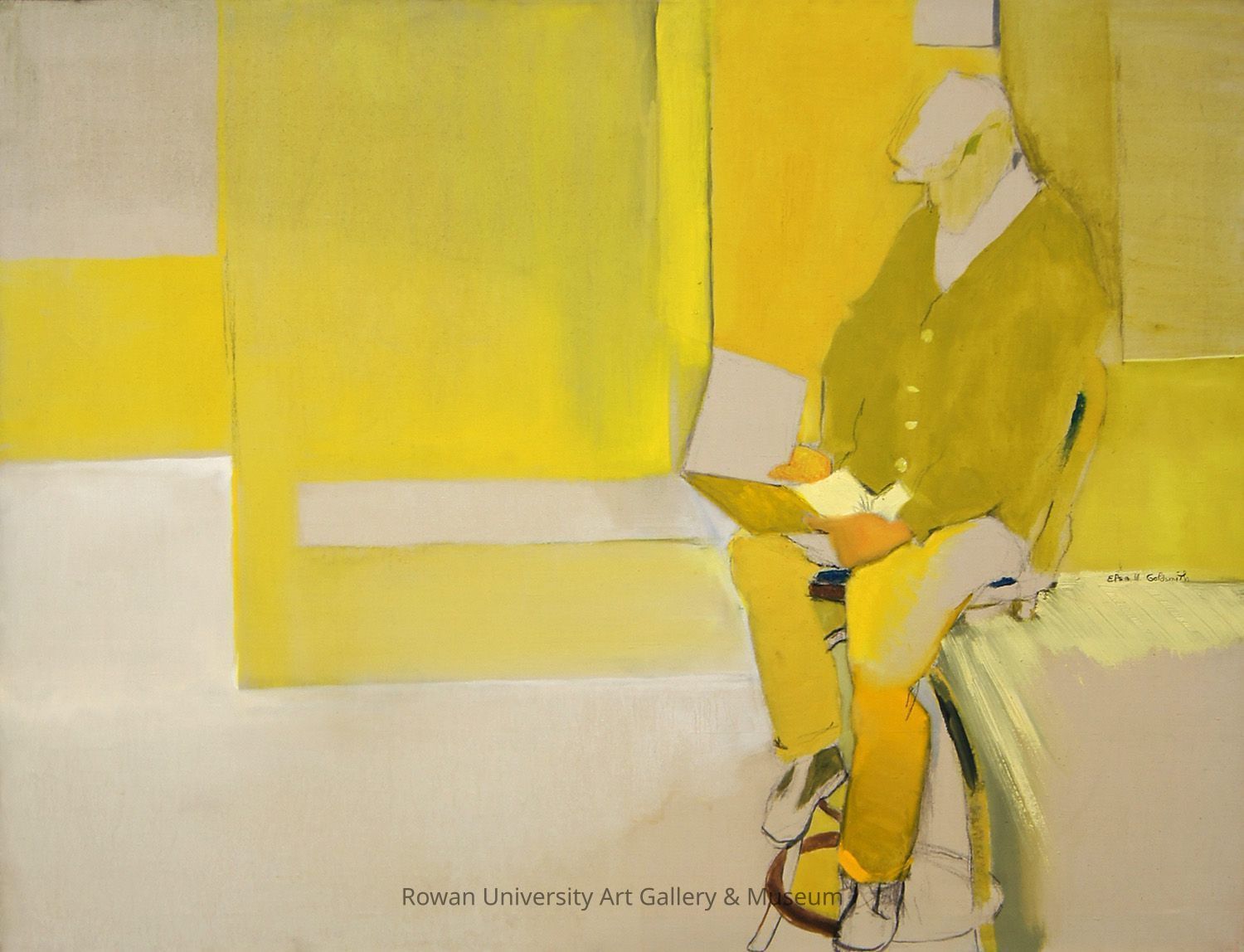 Loosely rendered, predominantly yellow representation of a man in a flat cap, jacket, and pants, seated on a stool and looking down at an open book; behind him are abstract shapes to suggest an interior space; the figure is located on the right side of the compositionType of Painting
