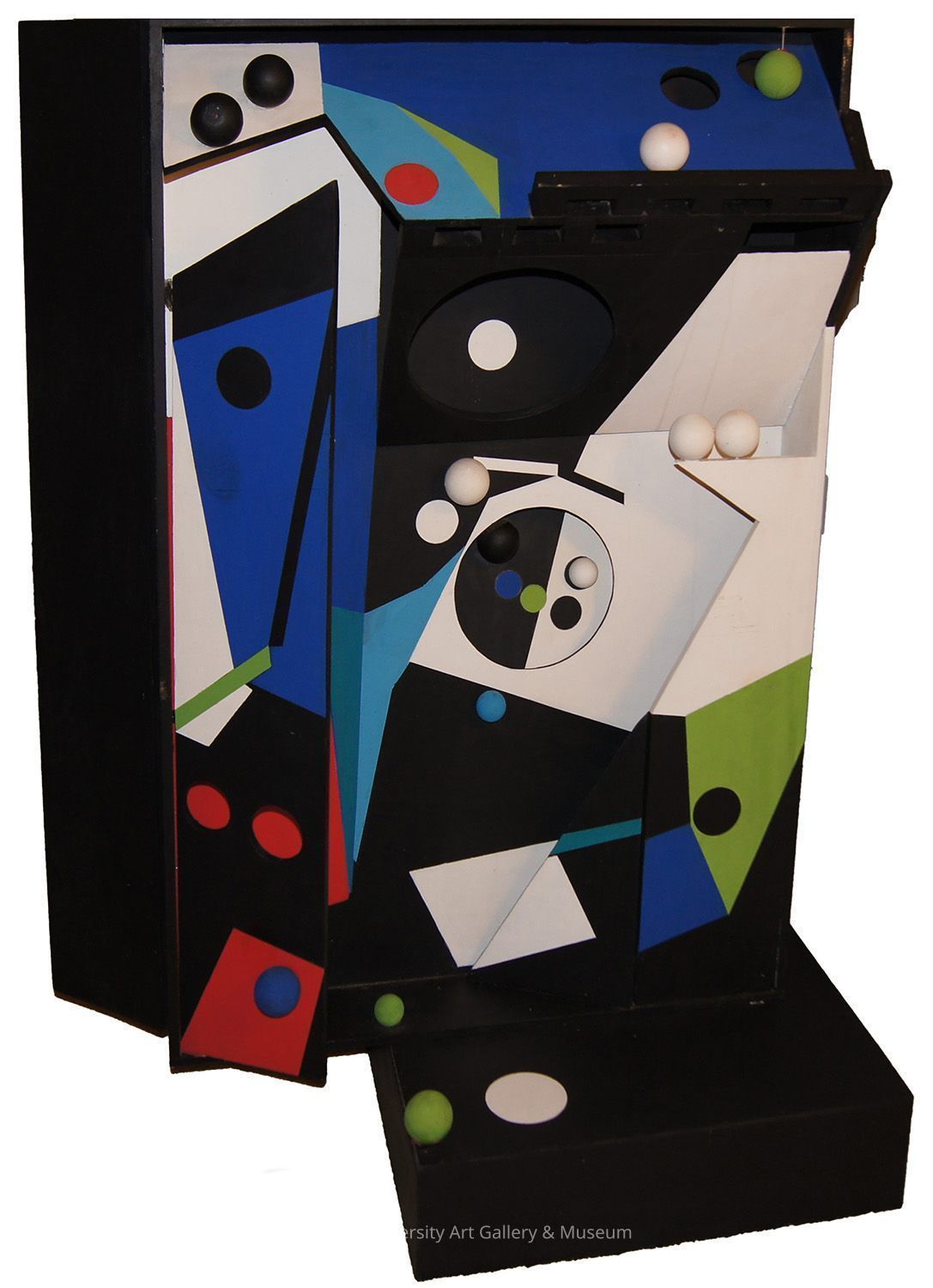 Large, nonrepresentational, irregularly shaped wood construction with angular, circular, and spherical forms, painted in black, blue, green, and redType of Sculpture