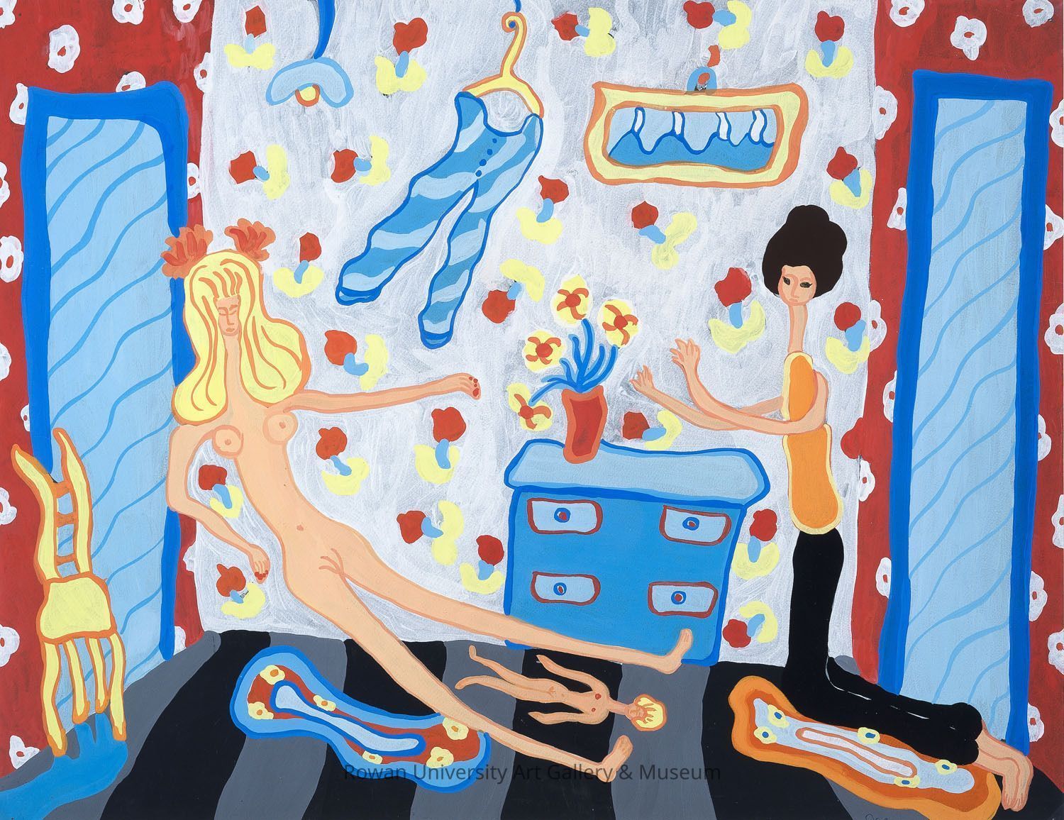 View of an interior with doorways on each side, a chair, a cabinet with a vase of flowers, a painting of a mountainous landscape, pants on a hanger, a black and gray striped floor with two multicolored rugs, and floral wallpaper in red, white, blue, and yellow; a clothed full-length figure kneels opposite a reclining nude full-length figure of a woman with a small full-length nude figure between her legsType of Painting
