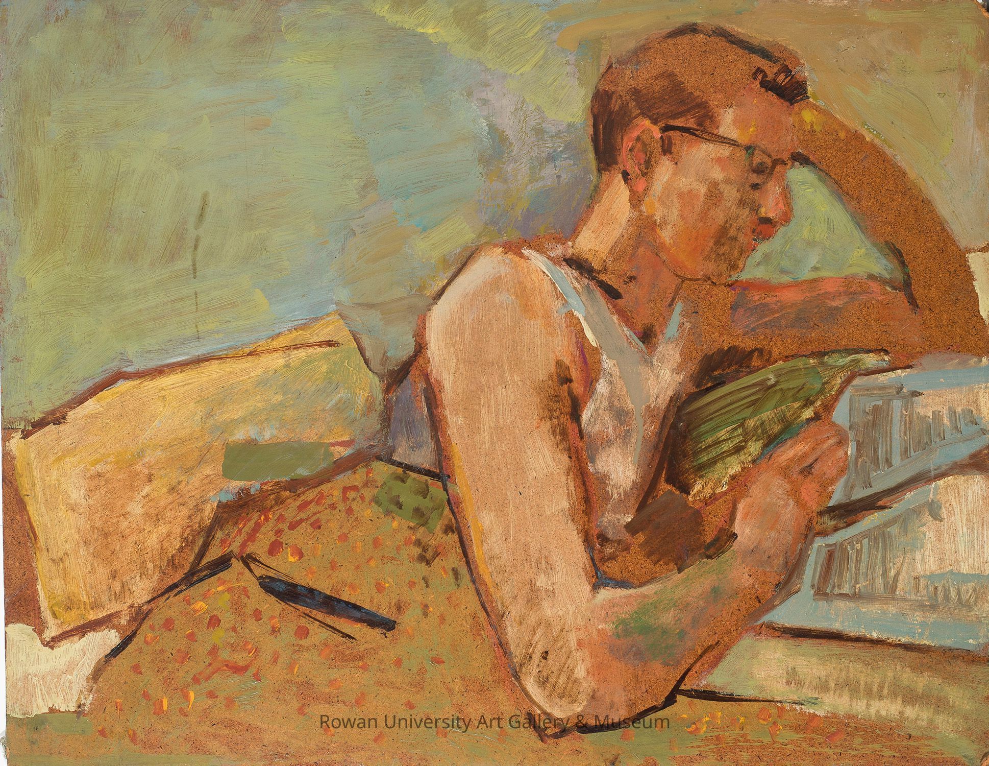Half-length profile painting of a reclining bespectacled man wearing a sleeveless white shirt, propped on two pillows with his left arm supporting his head while his lowered right arm touches the pages of a book or magazine; the background is loosely rendered in mostly blue, yellow, and orange; the blanket that covers his lower body is defined by a few lines while repeated daubs of paint suggest a patternType of Painting