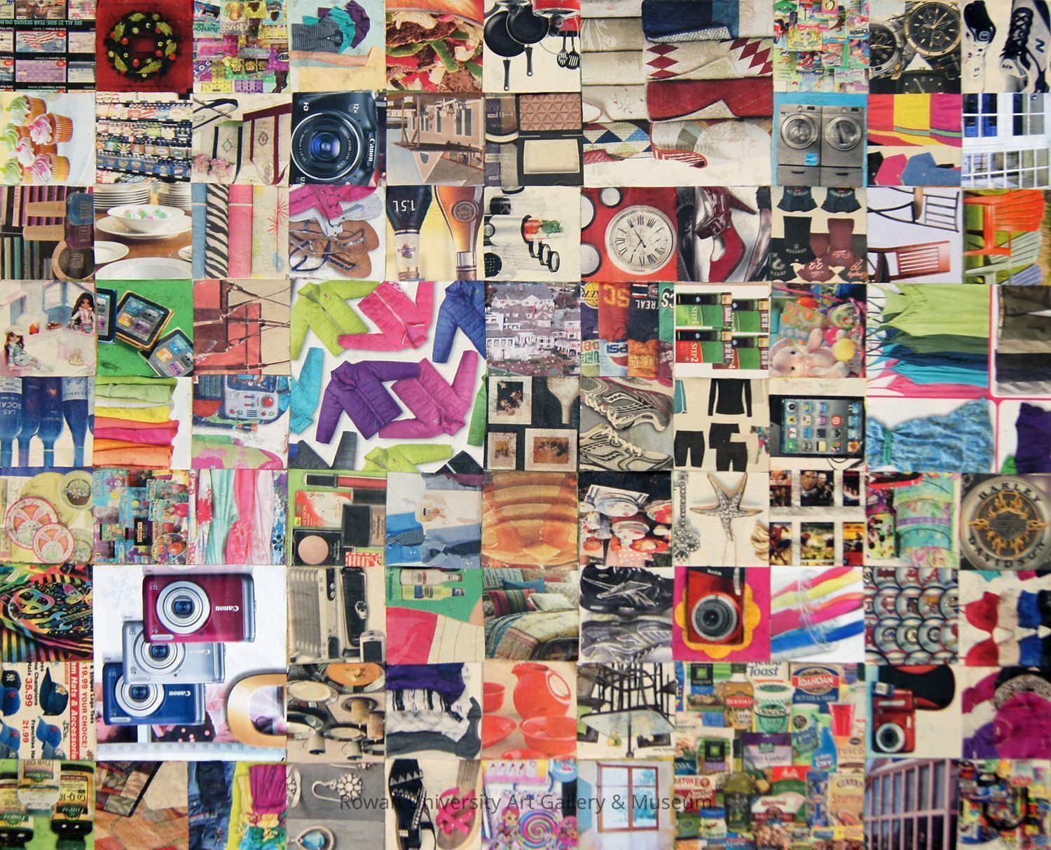 Collage of color advertisement cutouts, arranged in a grid-like pattern of smaller squares