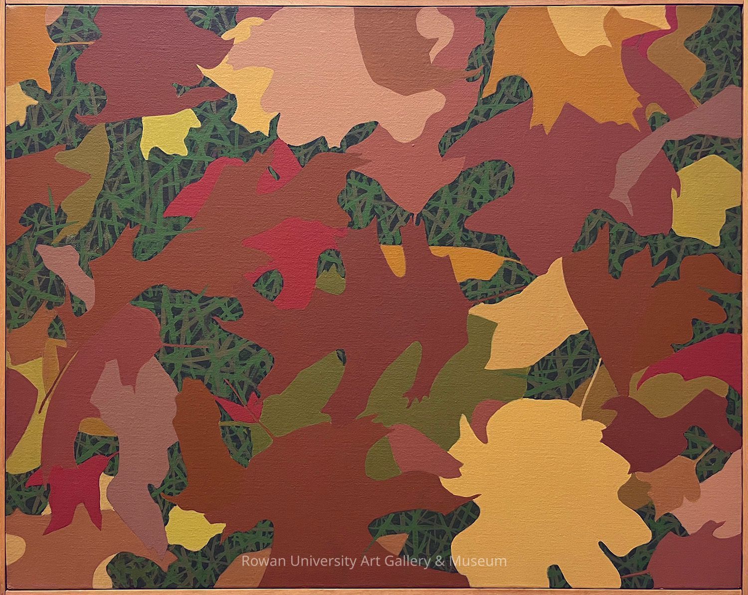 Close view of brown, red, orange, yellow, tan, and olive green leaves set against a dense network of green grassType of Painting