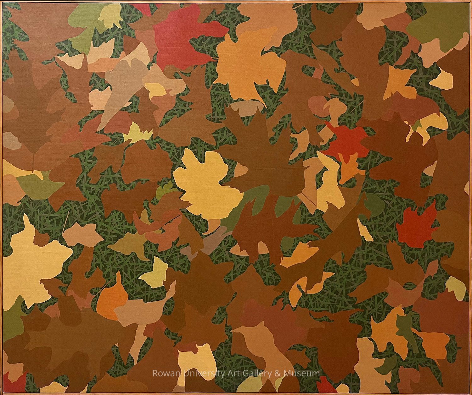 Close view of brown, red, orange, yellow, tan, and olive green leaves set against a dense network of green grassType of Painting