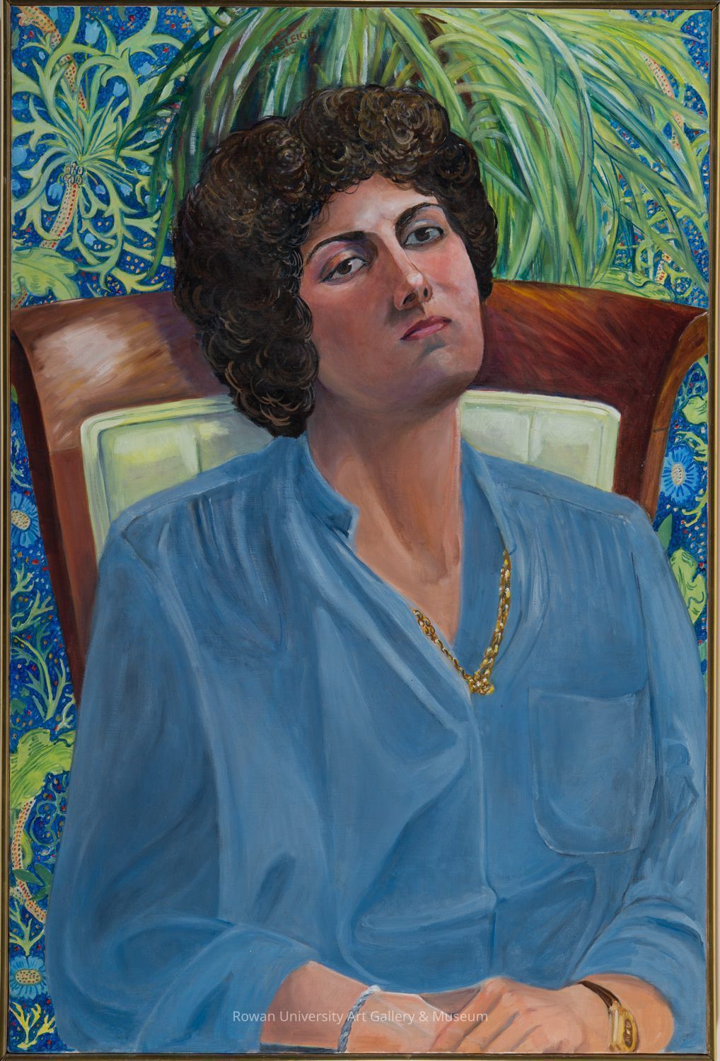 Half-length portrait of a seated woman with dark brown hair and blue blouse, set against the back of a chair, a plant with long green leaves, and patterned wallpaper with green and blue floral and plant motifsType of Painting