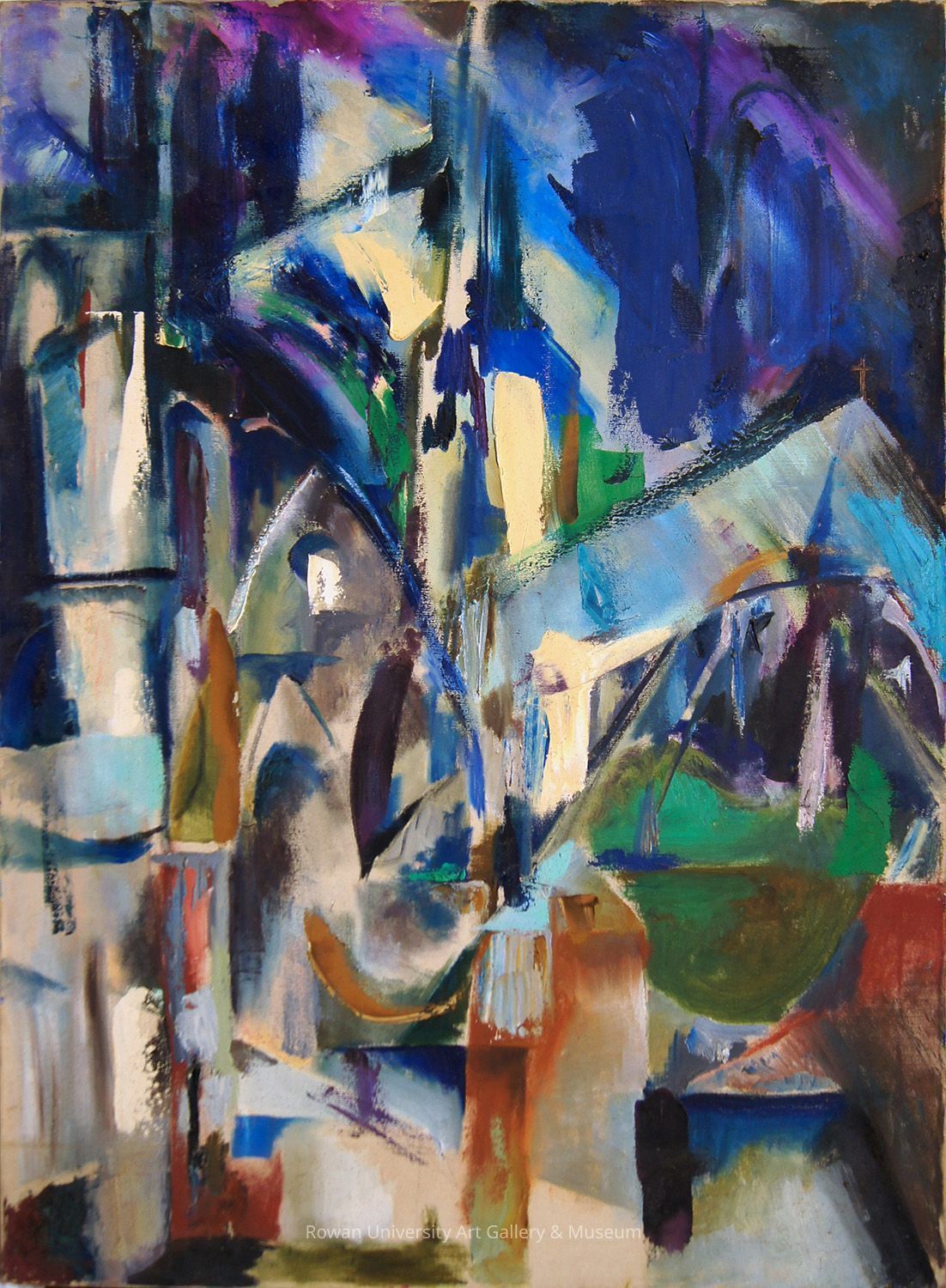 Abstraction of a church, composed of loosely rendered lines and broad, flat areas of blue, violet, green, off-white, and whiteType of Painting